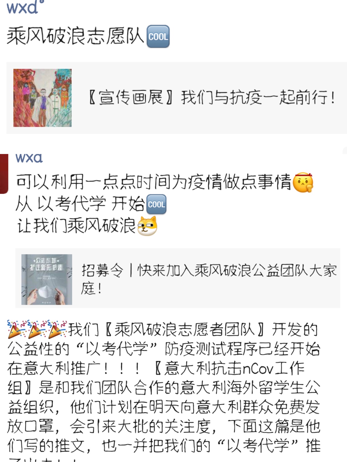 在疫情期间卫欣丹成为了乘风破浪志愿团队线下推广部一员。与其他志愿者协同工作,进行线上交流和推广,将防疫产品和有关疫情文案等进行交流改进和宣传,方便更多人了解防疫知识,让防疫精神得到更好的发扬。