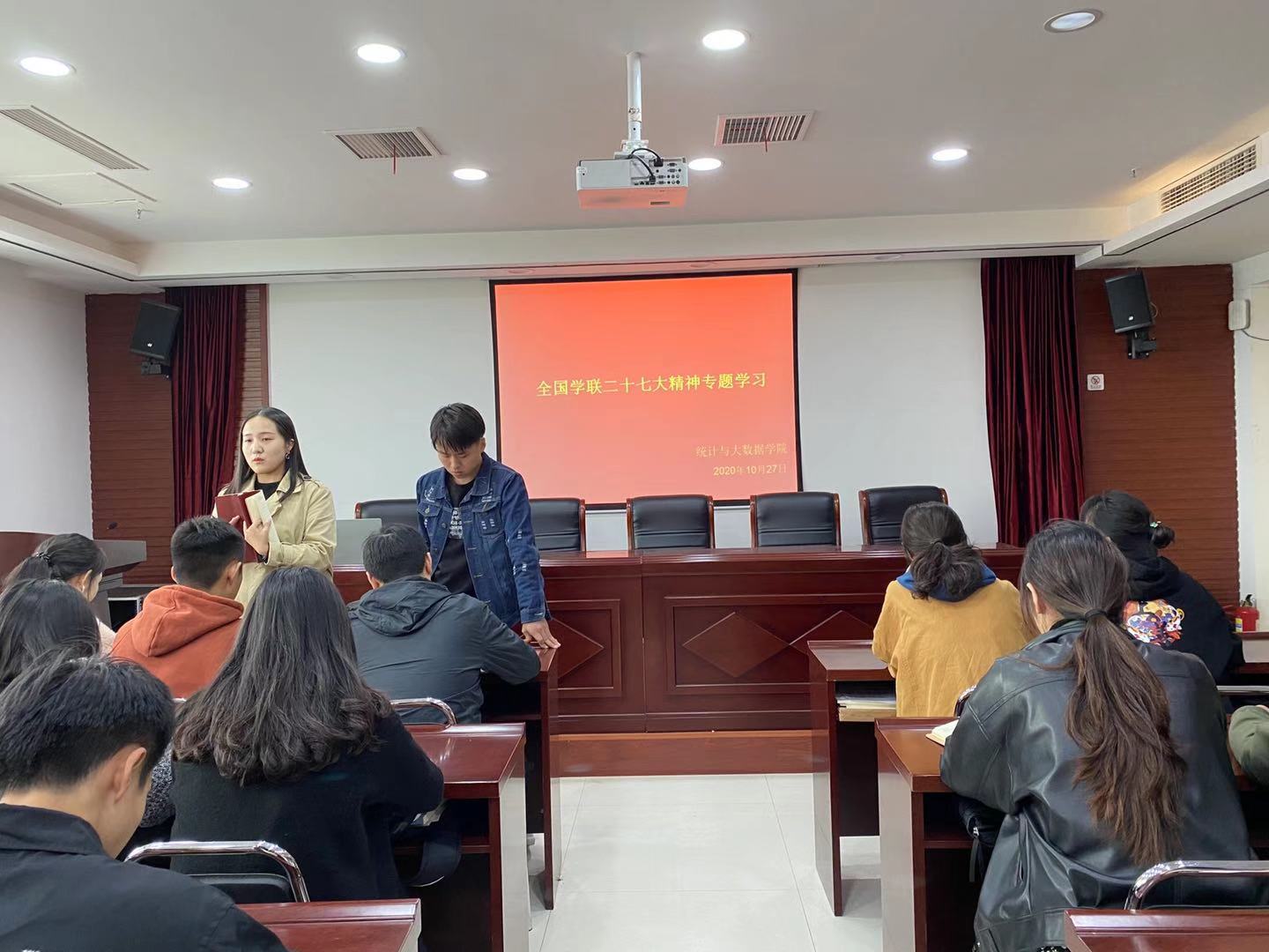 10月27日中午,我院在教科A828会议室组织学生代表学习全国学联二十七大精神。学院团委学生会学生代表,2018级、2019级、2020级班长支书共计40余人参会。会议由学生团委副书记张懿涵主持,学生会执行主席赵冲主讲。