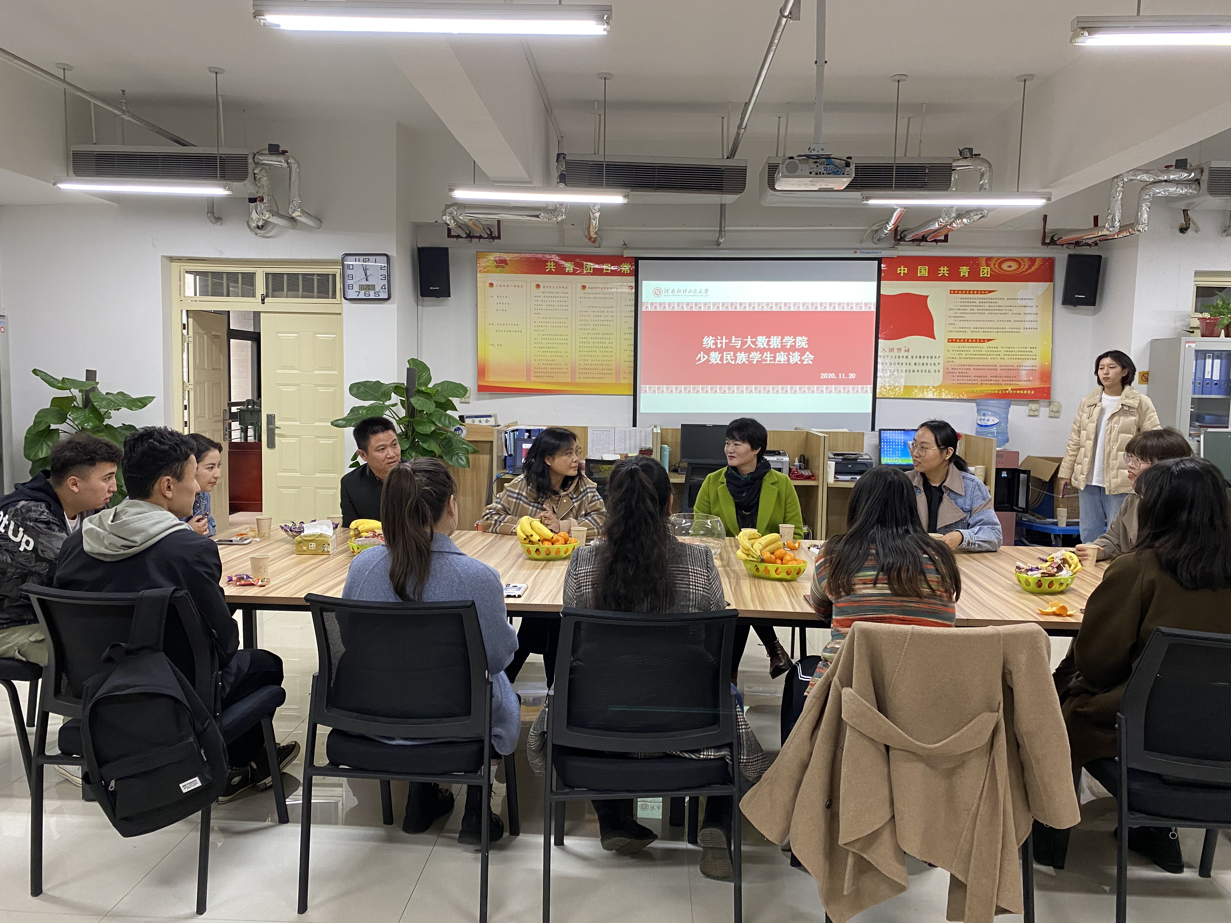 11月20日,统计与大数据学院在教科A829召开少数民族学生茶话会,新疆内派教师谭爱萍,统计与大数据学院党委副书记苗彤彤,辅导员郭粹、王昕、肖耀伟及8名新疆籍少数民族学生参会。