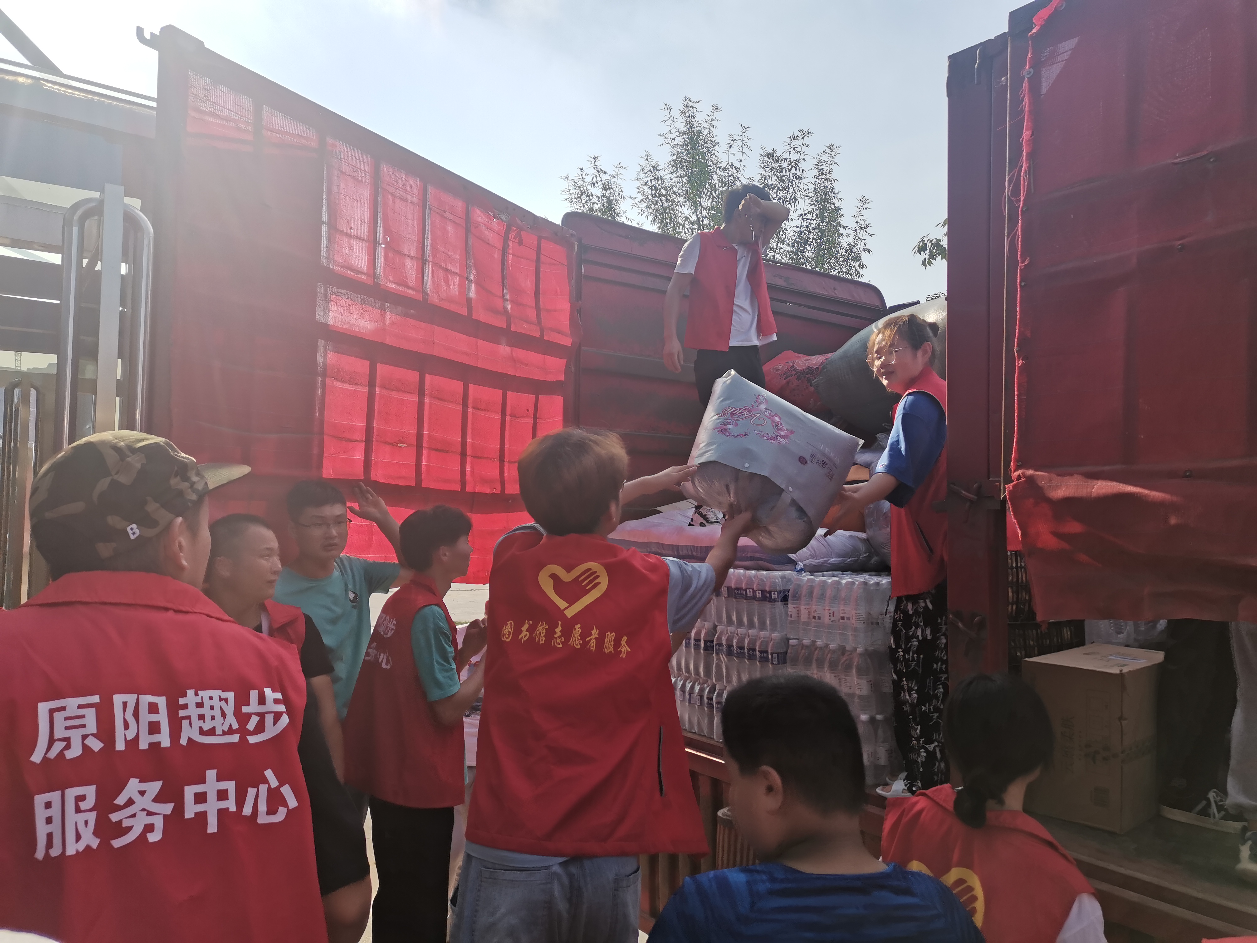 7月25日早上,程浩和他的同学通过网上信息平台了解到,支援新乡的车队九点半会在原阳图书馆集合统一出发。于是他们及时赶到,并帮助救援车辆装卸救援物资。