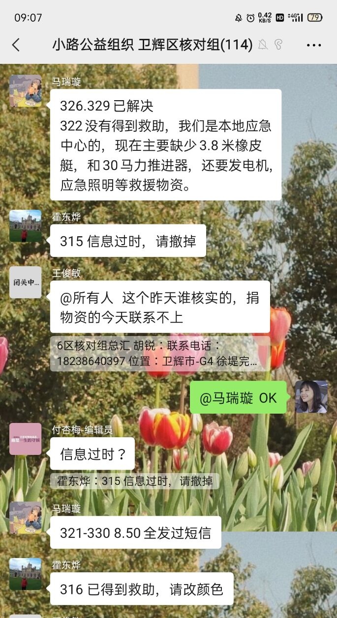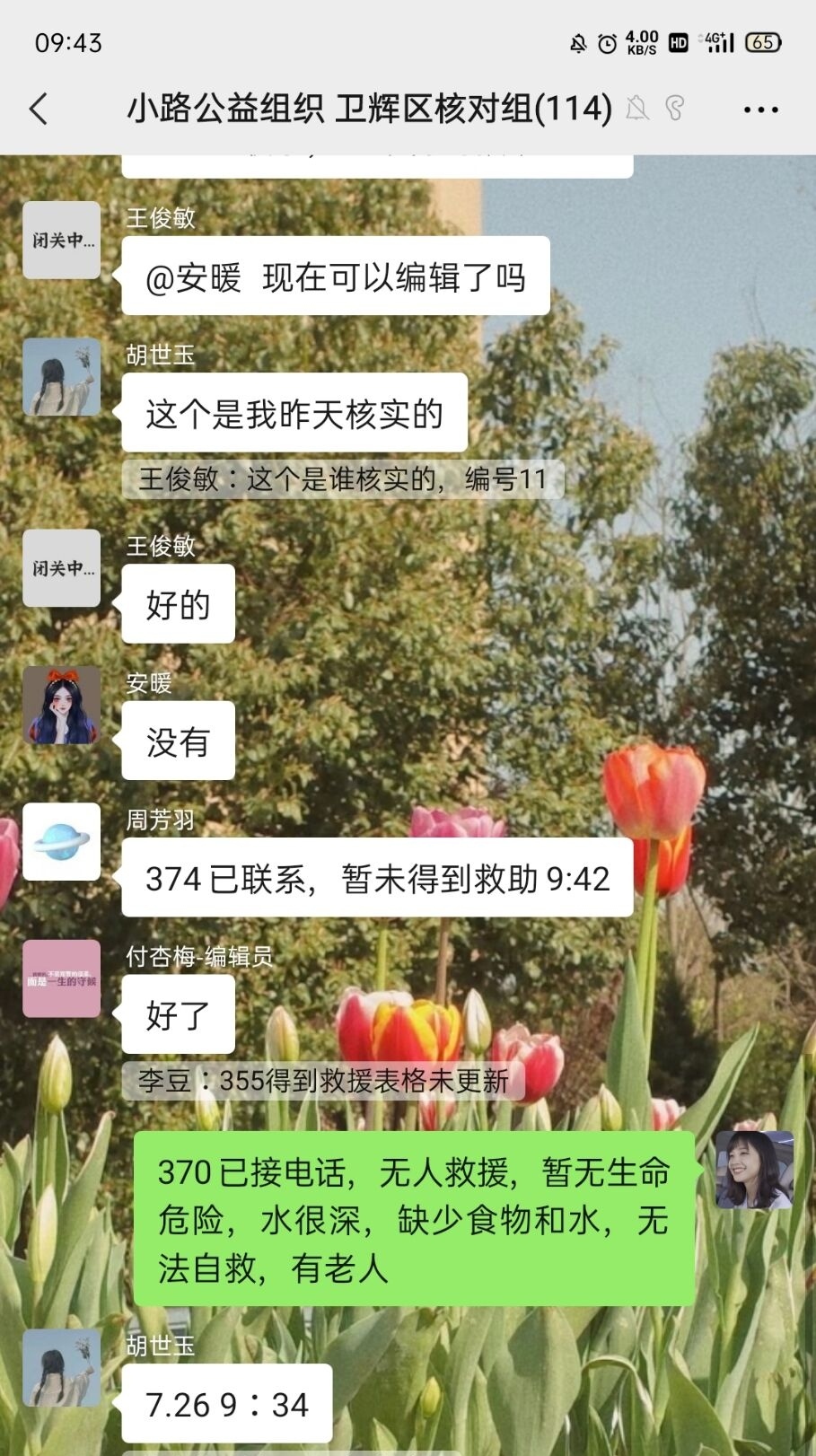 7月24日,李豆豆作为线上志愿者,加入小路公益卫辉市辉县市核对组,目前卫辉市对接400多条求助,其他各市也都有几百条。信息还在实时更新对接中,解决信息不对称问题,将表格发给各大平台和救援现场。