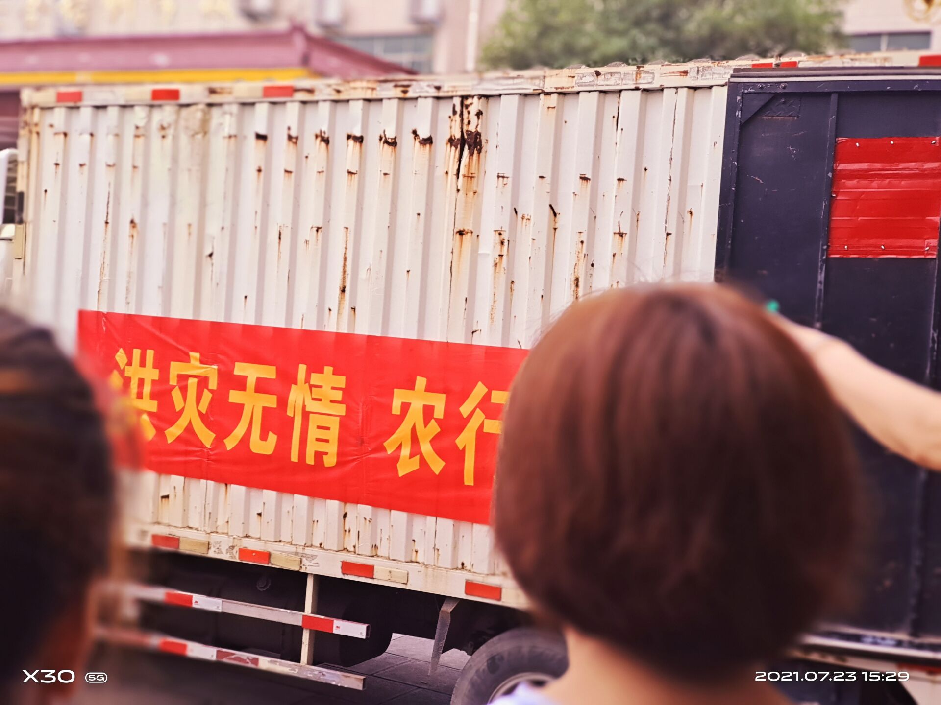 7月23日,一辆辆挂着“援助新密”的卡车穿梭在新密这座城市中,作为学院里的志愿者,刘畅回到家乡依旧踊跃参加志愿活动,前往新密市青屏山城和郑州市煤炭干部培训学校,与其余志愿者一起协助救援队伍搬运物资。