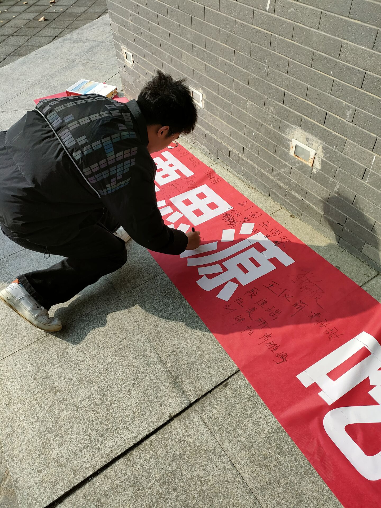 志愿者们身穿蓝马甲,在完成签到后,分三组开展活动。第一组志愿者负责引导就餐结束的同学在写有“饮水要思源,吃饭当节俭,粒粒盘中餐,皆是辛苦换”的条幅上签名,以增强厉行节约的决心。第二组志愿者负责为同学们提供纸巾,并向同学们讲解节约粮食的重要性以及收集有关光盘行动的建议。第三组志愿者帮助食堂打扫餐桌的工作人员清理餐桌,同时进行有关“光盘行动”的宣传活动。
