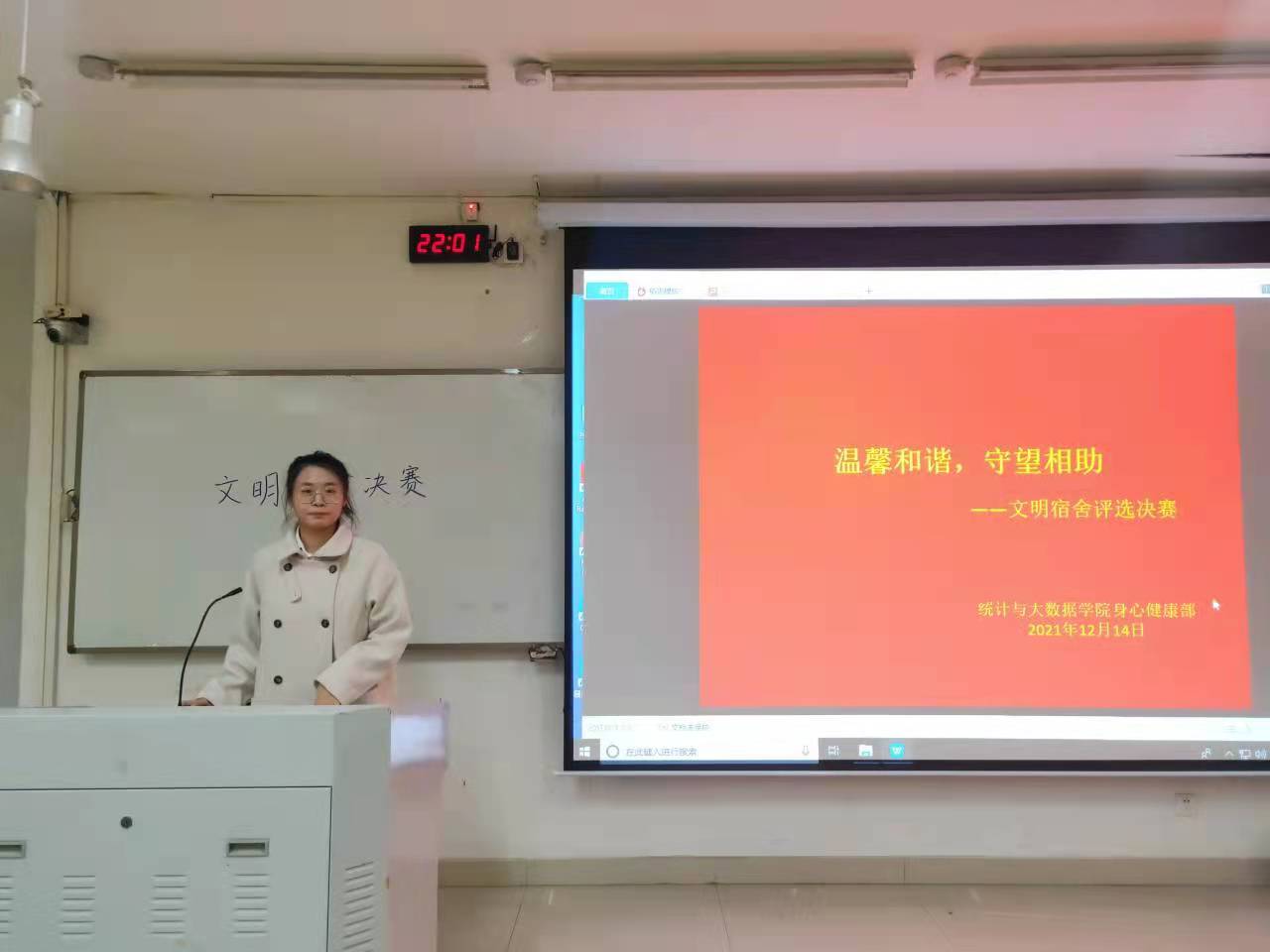 为加强宿舍管理,推动宿舍文化建设,改善宿舍环境,营造平安,尚学,文明,和谐的宿舍氛围,12月14日晚统计与大数据学院身心健康部于第二教学楼120教室进行文明宿舍评比决赛,本次大赛共有来自统计与大数据学院的35个宿舍参与。
