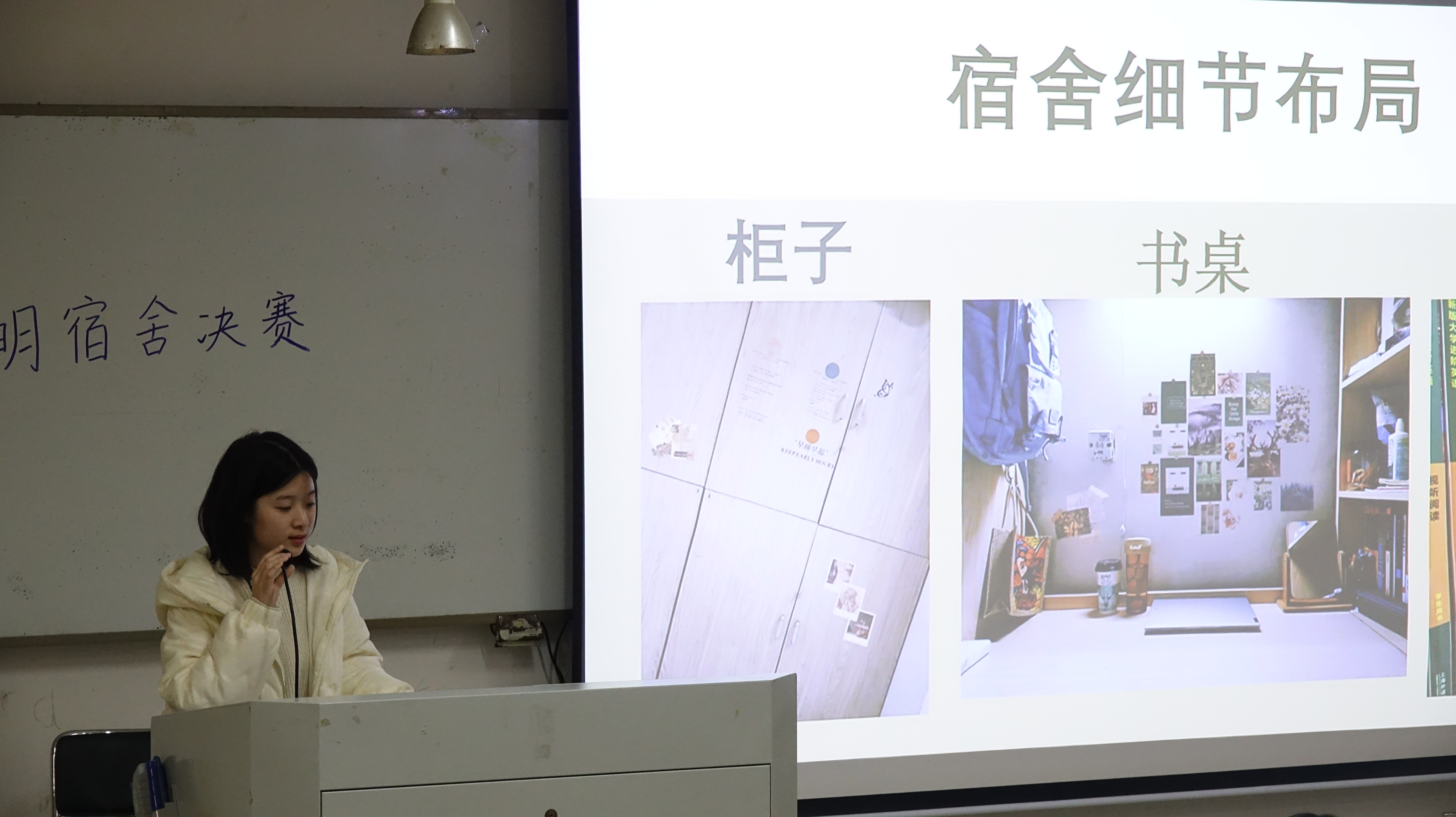活动伊始,统计与大数据学院身心健康部部长简要陈述大赛注意事项。之后,参与优秀宿舍评选的宿舍代表依次进行宿舍展示,整个展示过程别出心裁,令人眼前一亮,视频中一间间温馨浪漫的小屋,几个志同道合的人,一段真诚浇筑的情感,便组成了我们求学生活中最珍贵的家的回忆。各位宿舍代表围绕着成员介绍,宿舍环境,安全准则,宿舍文化与精神进行了ppt演示,为与会观众带来了一副副明净优雅的画卷,一帧帧唯美的享受。阳光,团结,文明,规范也成为本次大赛最为频繁,突出的关键词,我们看到的不仅仅是干净整洁,光鲜亮丽的环境,更是一个个明德惟馨的集体。