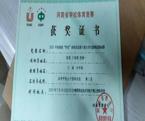 于倩颖同学在第十届大学生跆拳道锦标赛中荣获女子团体竞技第二名的好成绩。