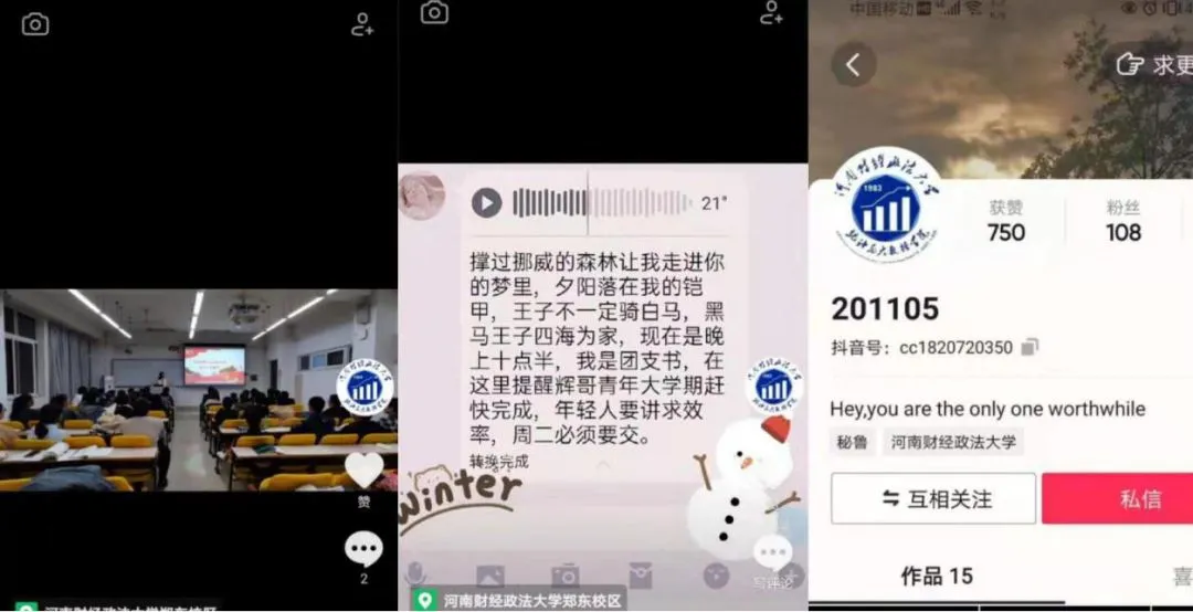 在互联网横行的大数据时代,几乎所有活动都能以互联网+的形式展现在众人面前。为了更好的宣传本支部特色文化,我们注册了属于本支部的抖音账号,并通过小视频的形式宣传支部文化。切合本支部成员所学专业内容,进行支部特色文化宣传。文艺委员负责收集视频剪辑材料,宣传委员负责视频的剪辑和文案编写,全体支部成员各展风采。