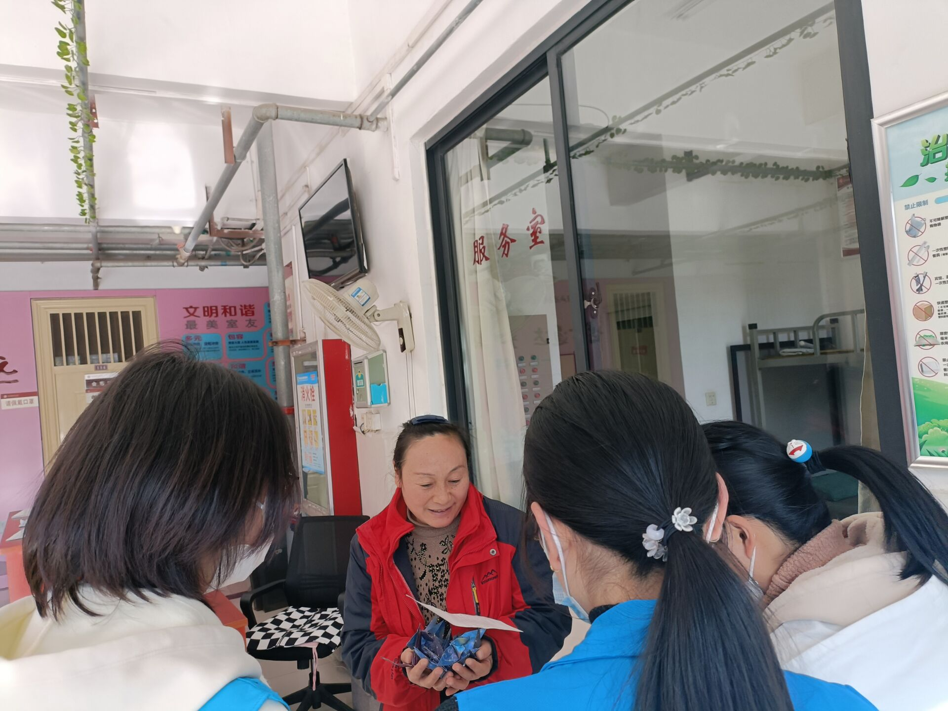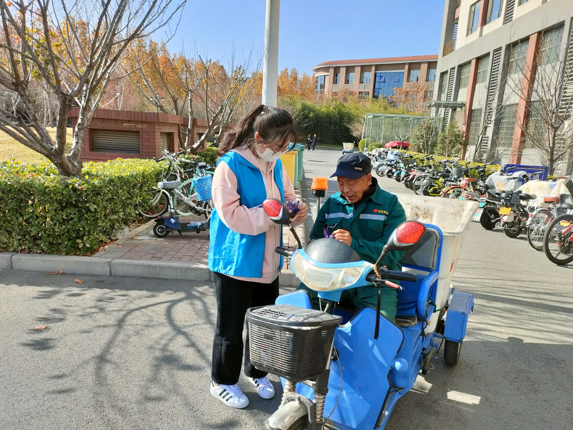 活动当天,志愿者们被分为三组,分别开展不同的活动。第一、二组志愿者于上午七点半在第二餐厅门口集合,工作人员签到后,志愿者们身穿蓝马甲,分别开始志愿者活动。第一组负责帮助打扫校园的环卫工人打扫路边的落叶,并送去手套抵御寒风;第二组志愿者拿上口罩、热水为他们送上温暖。随后,第三组志愿者于中午十二点半为宿管阿姨送去征集来的卡片和小礼物,并为老师送去表示感恩的小礼物和真挚的祝福。活动在志愿者们的积极配合下顺利完成。