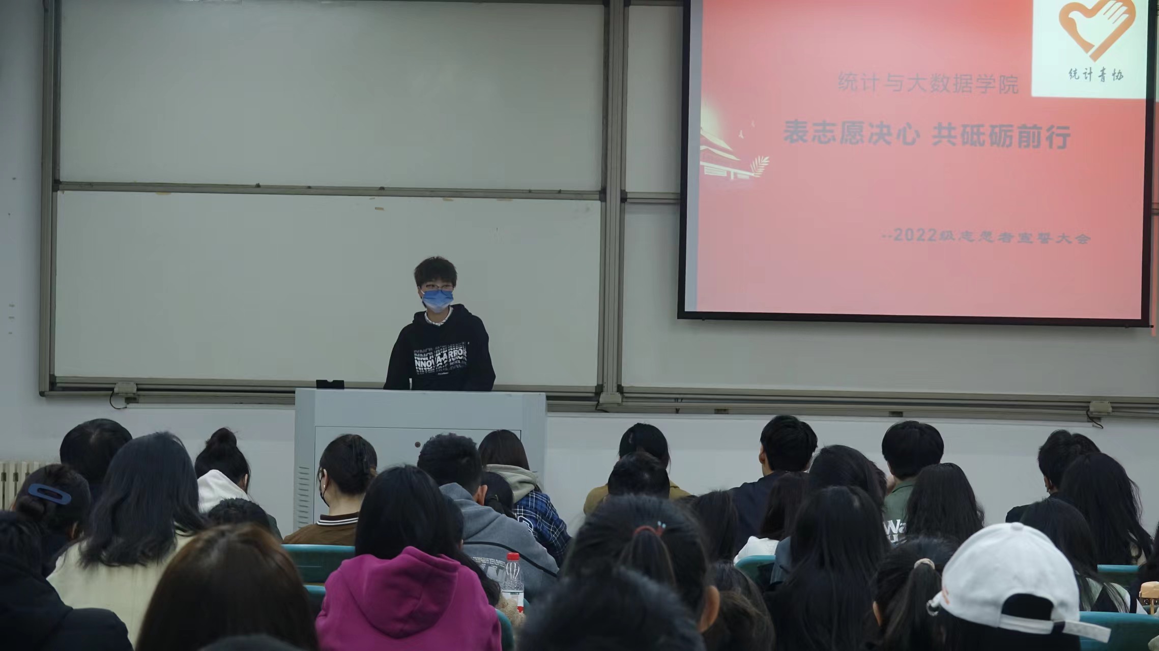 会议伊始,志愿者协会会长向志愿者们讲解了青年志愿者协会的部门结构、志愿者精神“奉献、互助、友爱、进步”的内容及“热情献社会 真情暖人心”的核心主旨。优秀志愿者代表们发挥榜样作用,讲述其参与志愿活动留下的深刻印象与心得感受,激发了2022级志愿者们的参加志愿服务动力。会议最后,志愿者们全体起立郑重宣誓,誓词铿锵庄重,感染在场的每一名志愿者。