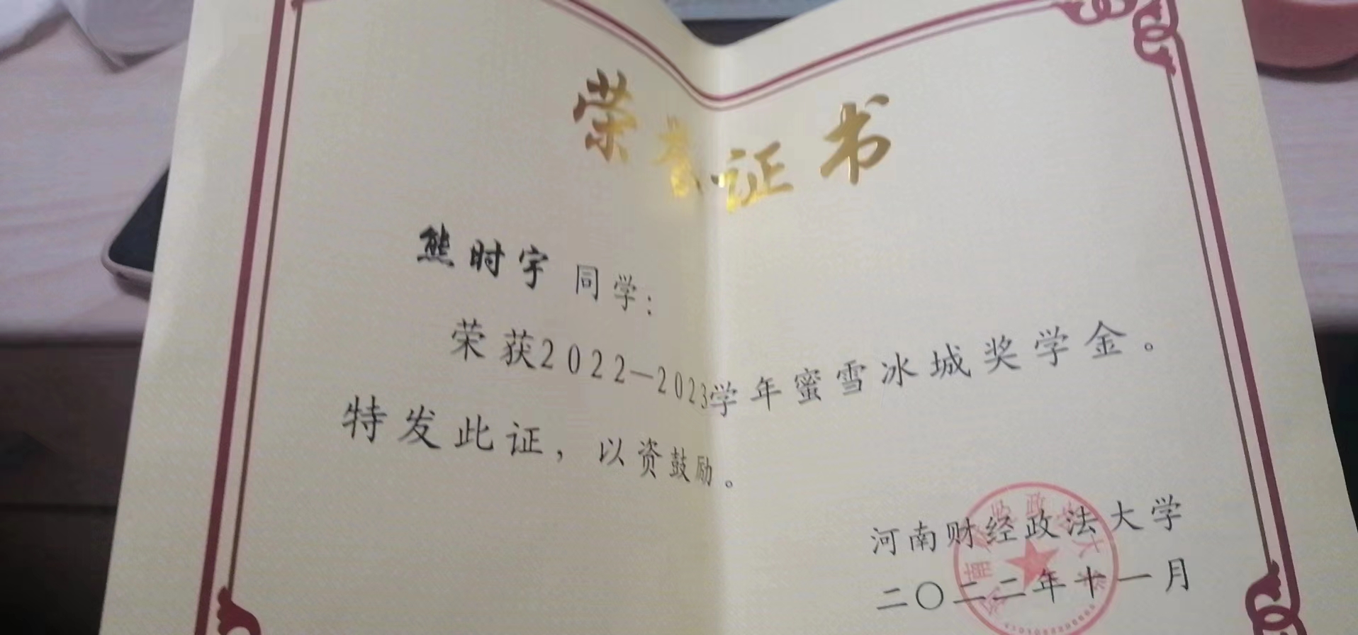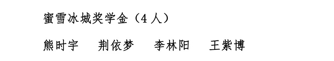 此次,我院共有4位优秀学子获得“蜜雪冰城奖学金”,除熊时宇外,还有191107班荆依梦,201106班李林阳,201106班王紫博。