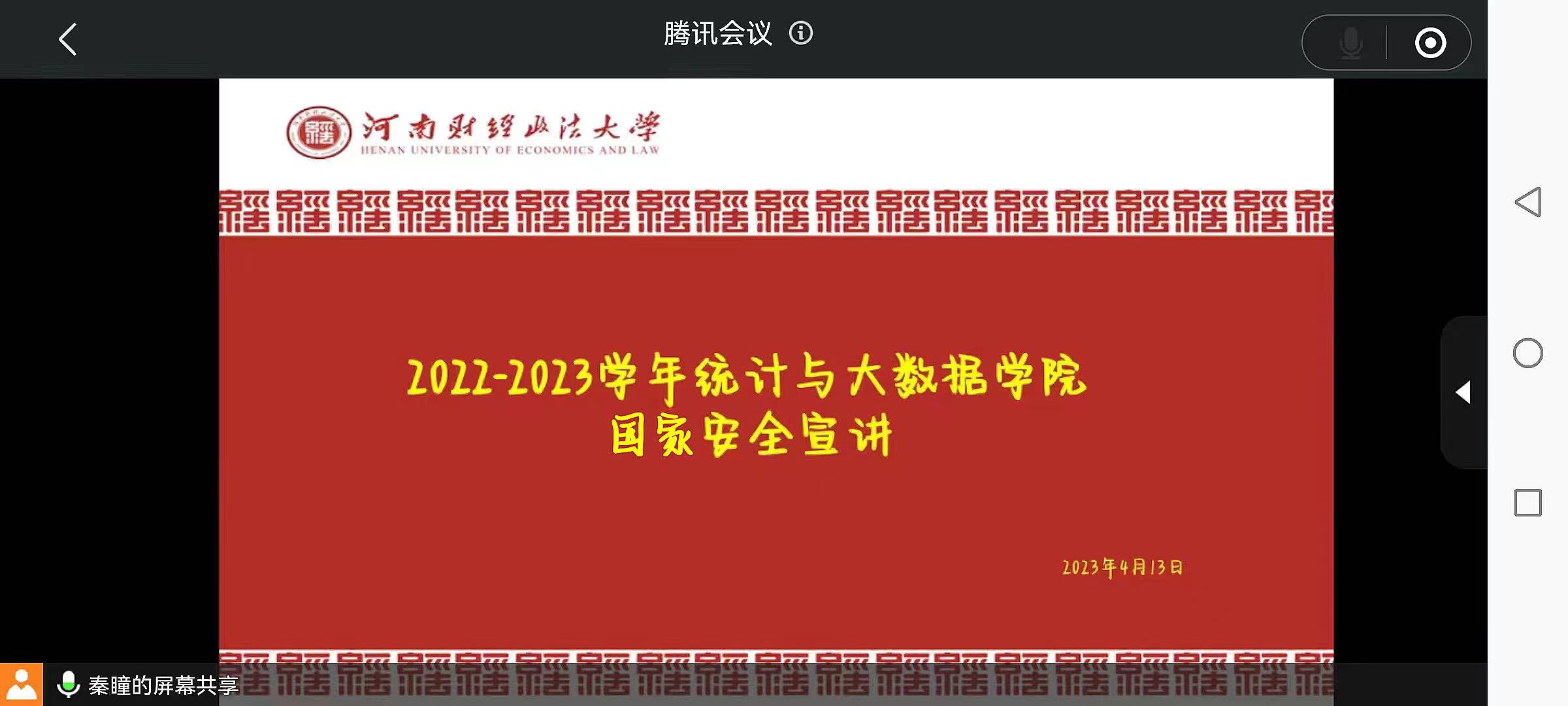 为更好传达上级国家安全会议精神,牢固树立我院学生生态安全意识,我院于4月14日下午一点半通过腾讯会议开展线上院系国家安全教育宣讲。本次会议由青年发展部部长主讲,2022级全体同学及青年发展部成员参加会议。