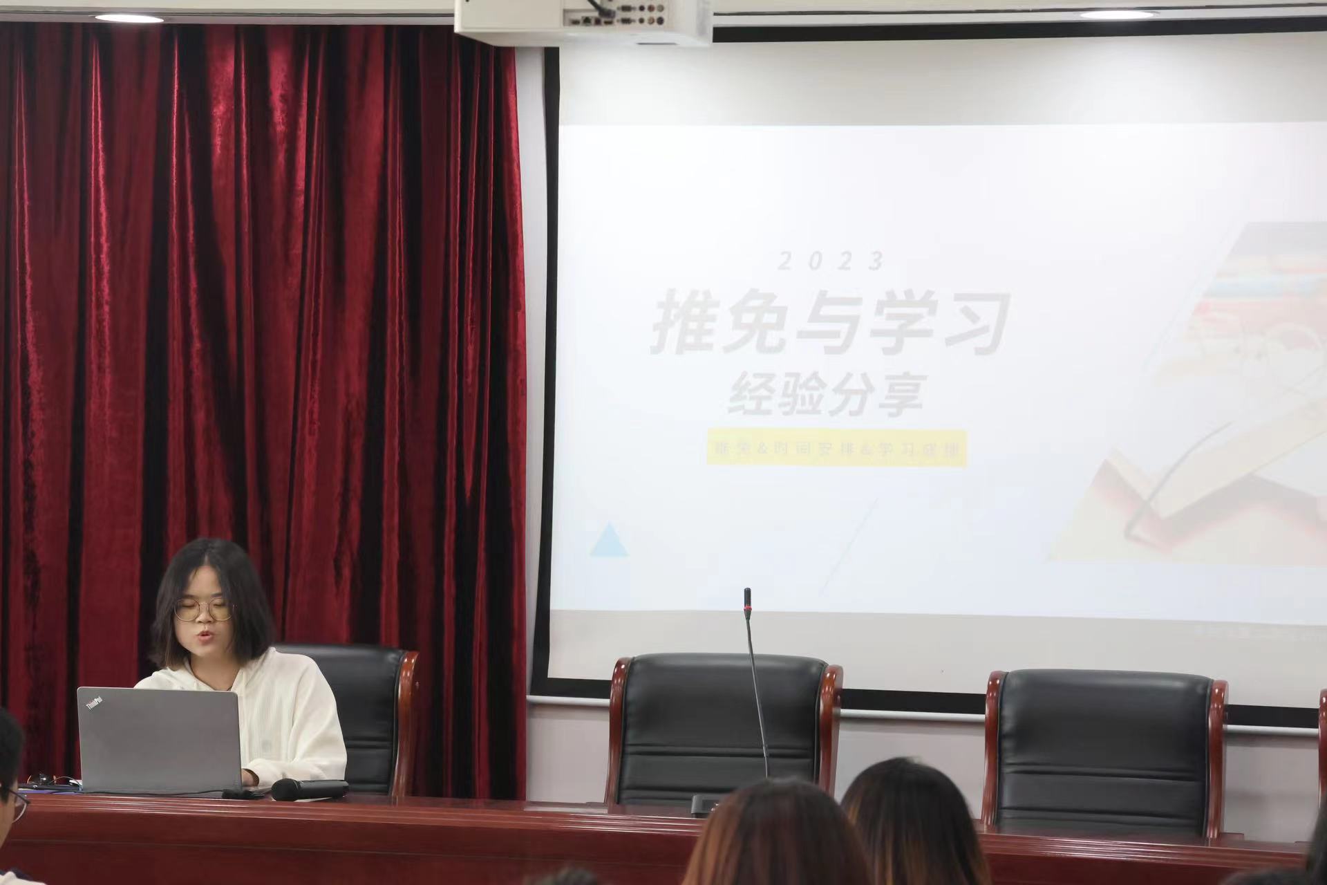 10月9日中午,我院于教学科研楼828室举行2023年获推免资格学生干部先进经验交流分享活动。邀请2023年获推免资格、曾任职院团委学生会主要学生干部的2名学生主讲,院全体学生干部(包括22级、23级班长、支书)参与活动。