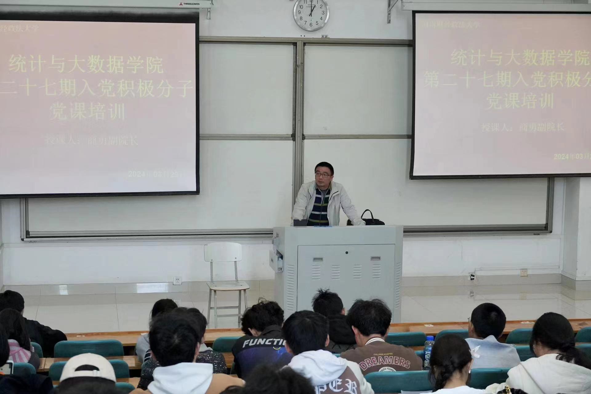 2024年3月29日中午,统计与大数据学院于教学科研楼209教室开展第二十七期入党积极分子培训工作,本次培训由商勇副院长主讲,学院全体入党积极分子参与培训。