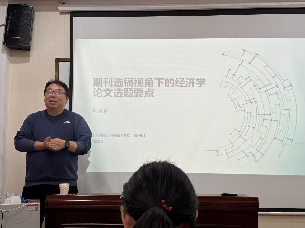 3月19日,山西财经大学教授、国家社科基金重大项目首席专家、《山西财经大学学报》《统计学报》副主编马克卫教授,应邀来我院作了题为《期刊选稿视角下的经济学论文选题要点》的学术报告。我院青年教师及研究生共同聆听了此次报告。