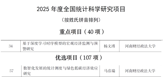 近日,2025年度全国统计科学研究项目立项名单公布,我院杨文溥老师申报的《基于深度学习时序模型的宏观经济监测与预警研究》(重点项目)和马彦瑞老师申报的《数智化发展的统计测度与绿色低碳经济效应研究》(优选项目)同时获批。继2024年获批一项后,学院今年再获两项立项,充分彰显了我院在统计学科领域的持续积累与强劲势头。