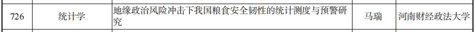 近日,全国哲学社会科学工作办公室公布2025年度国家社会科学基金项目立项名单,我院马瑞老师申报的《地缘政治风险冲击下我国粮食安全韧性的统计测度与预警研究》成功获批一般项目。国家社会科学基金项目是我国哲学社会科学领域最高级别科研项目,此次立项不仅是对个人学术水平与研究能力的高度认可,对我院科研工作的高度肯定。