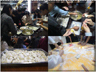 在12月22日下午17:00活动准时开始:同学们围坐在一起,同学们都开始亲手实践,和面的和面,擀皮的擀皮,包饺子的包饺子,放饺子的更把饺子放得错落有致,场面很是精彩。同学们别出心裁地设计着与众不同的饺子样式,有精致小巧的柳叶饺,也有个大饱满的东北饺。