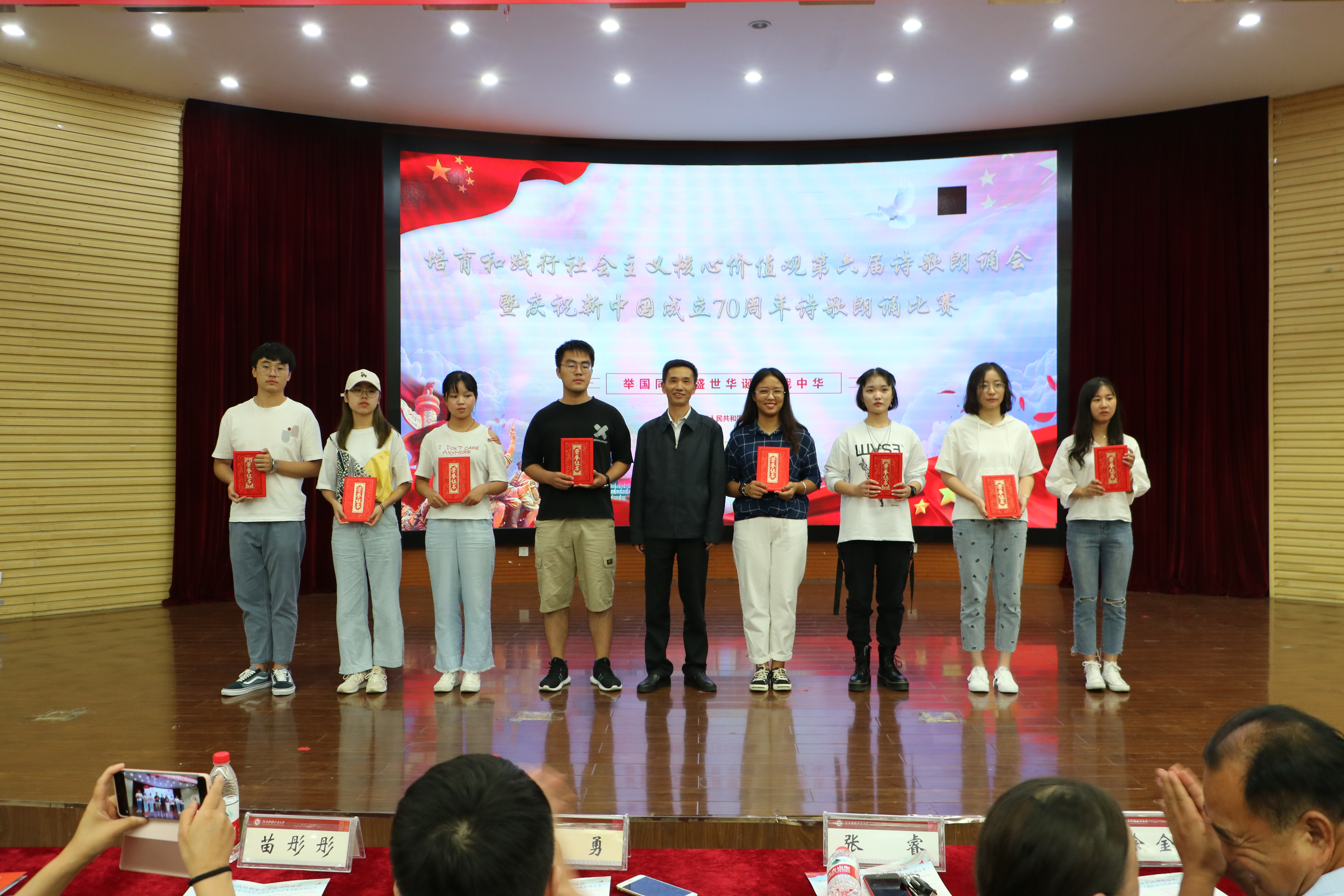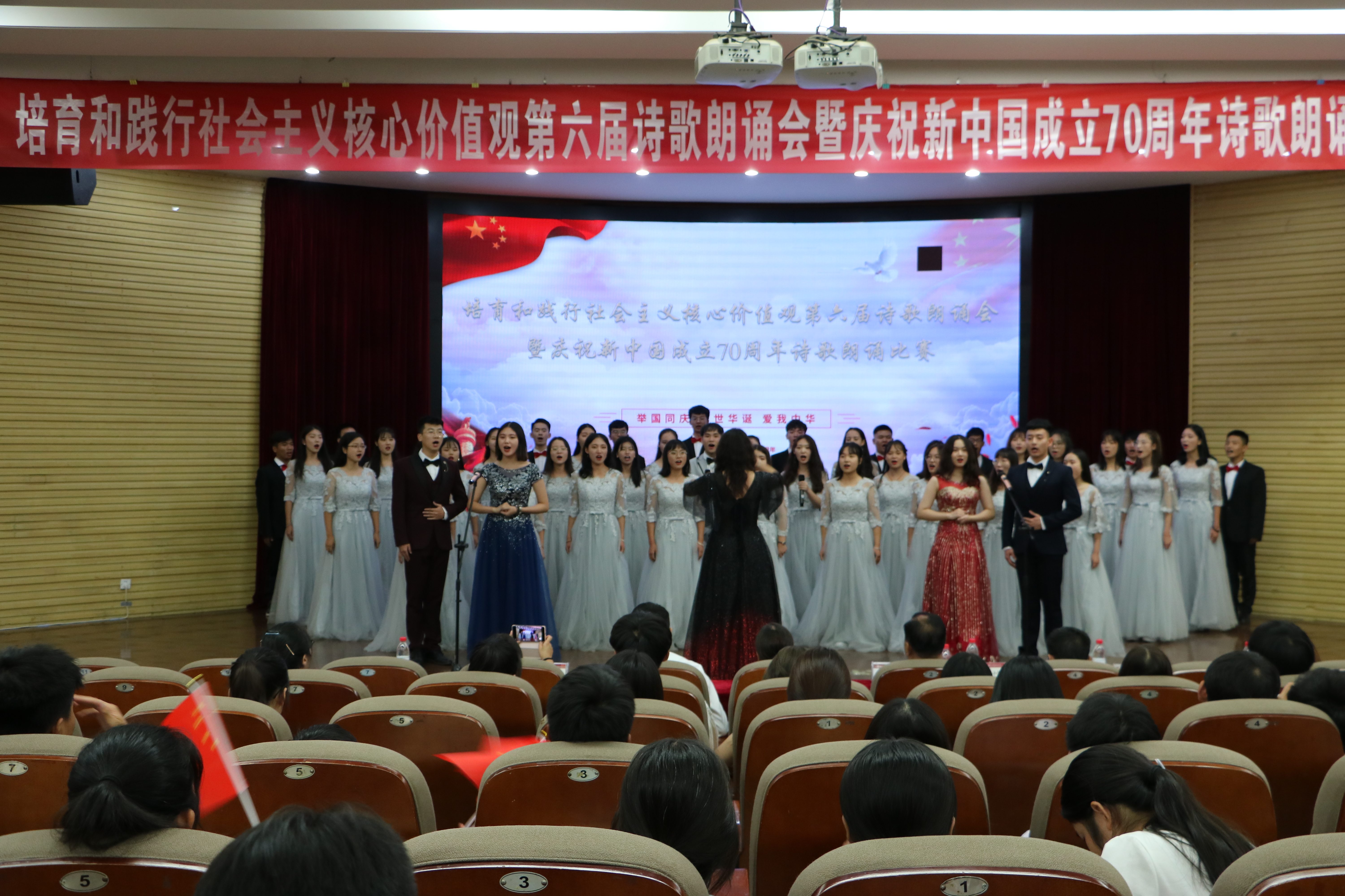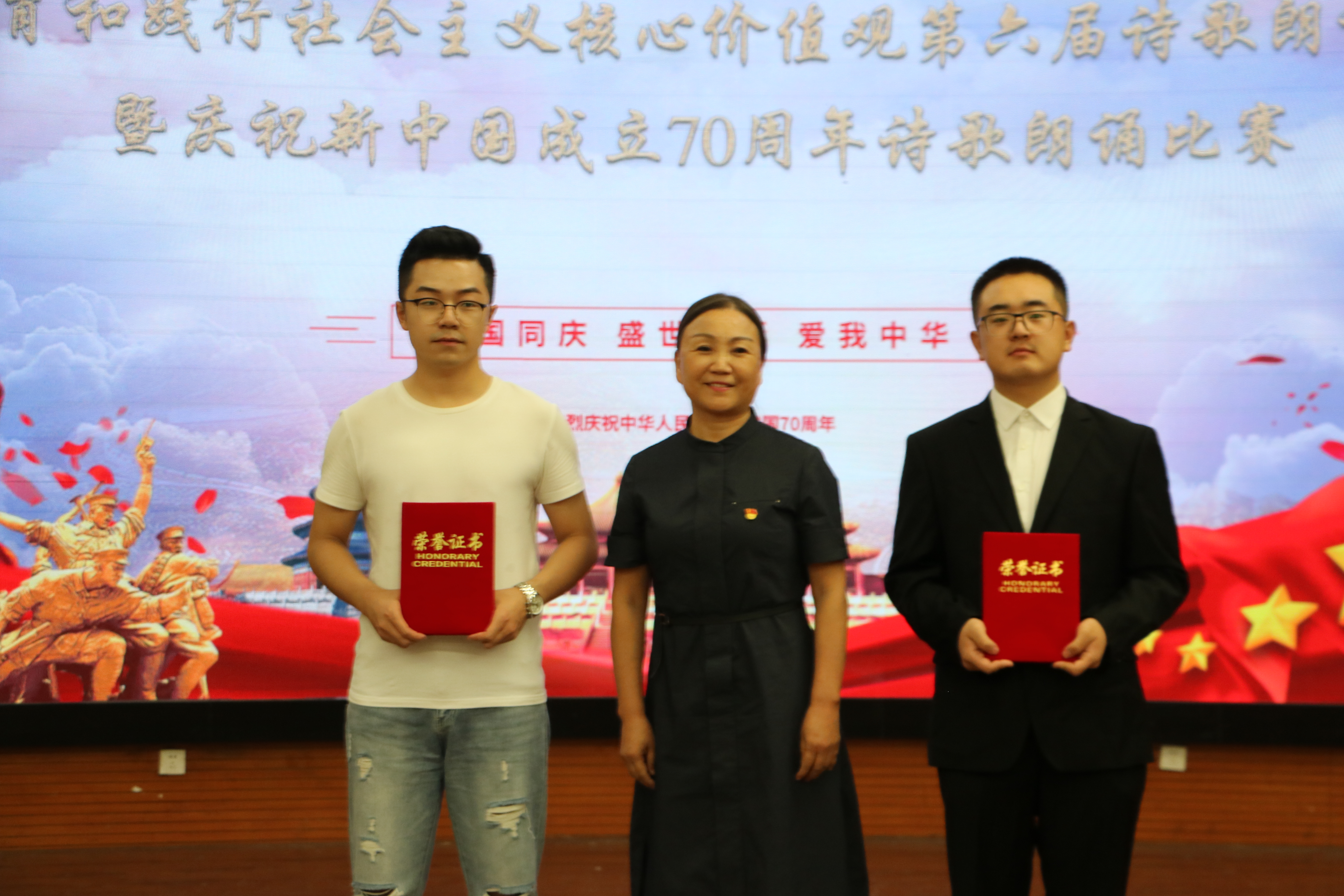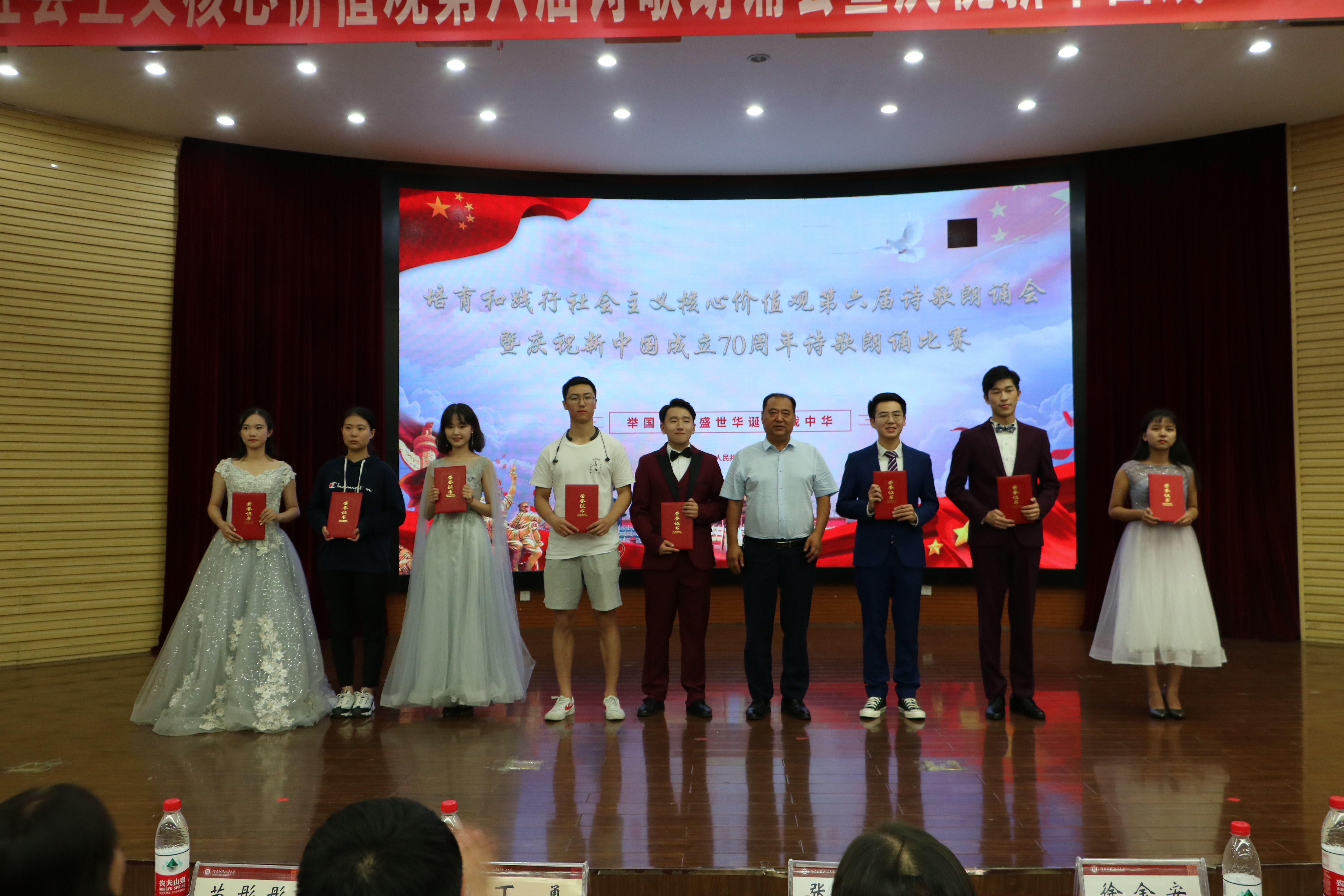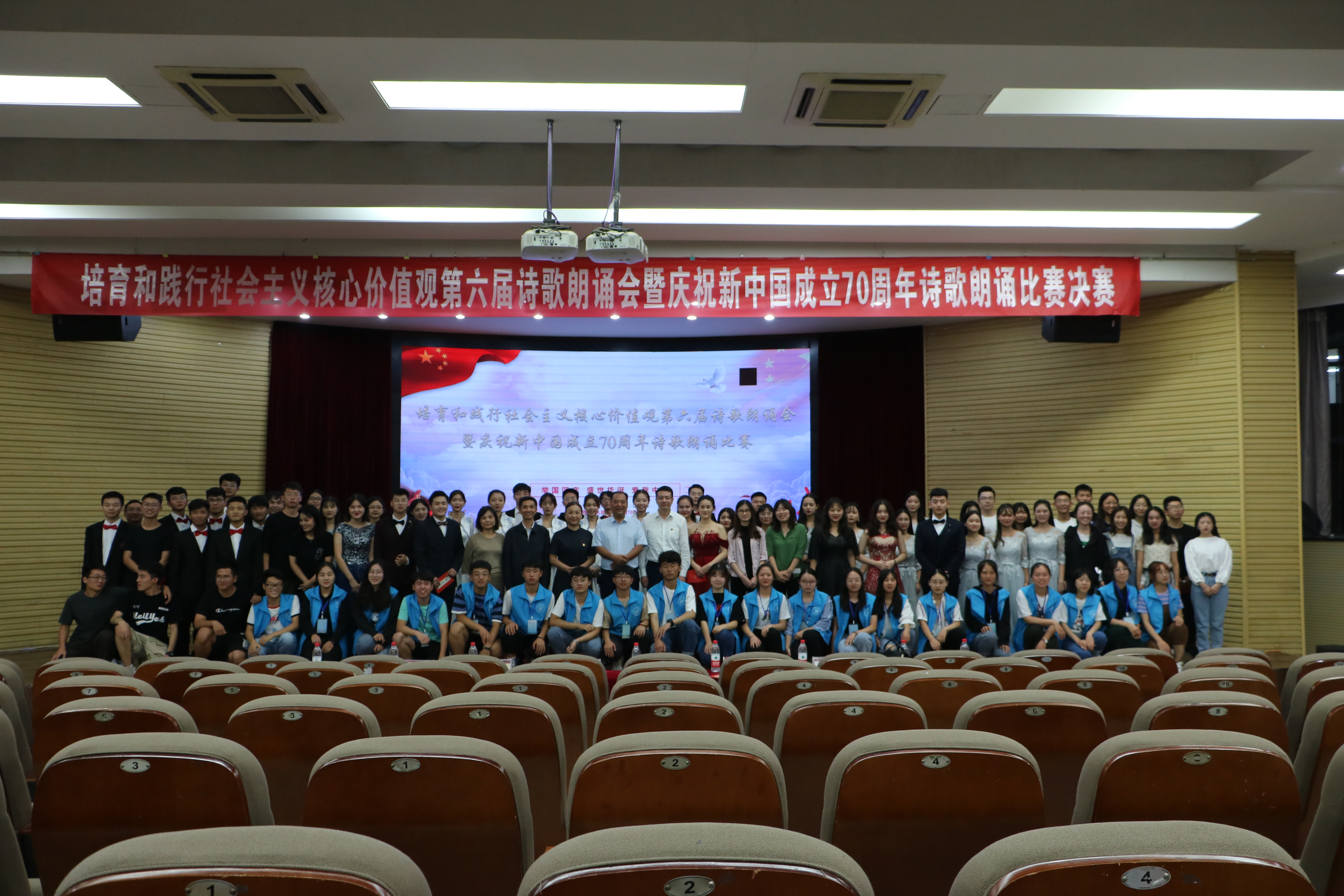 9月24日,由校党委宣传部主办、统计与大数据学院承办的培育和践行社会主义核心价值观第六届诗歌朗诵会暨庆祝新中国成立70周年诗歌朗诵比赛决赛在第一教学楼219报告厅举行。校党委宣传部部长张睿、副部长丁勇,校团委副书记李曼,统计与大数据学院党委书记徐金安、院长刘定平、党委副书记苗彤彤等领导老师与400余名学生共同观看了比赛。
