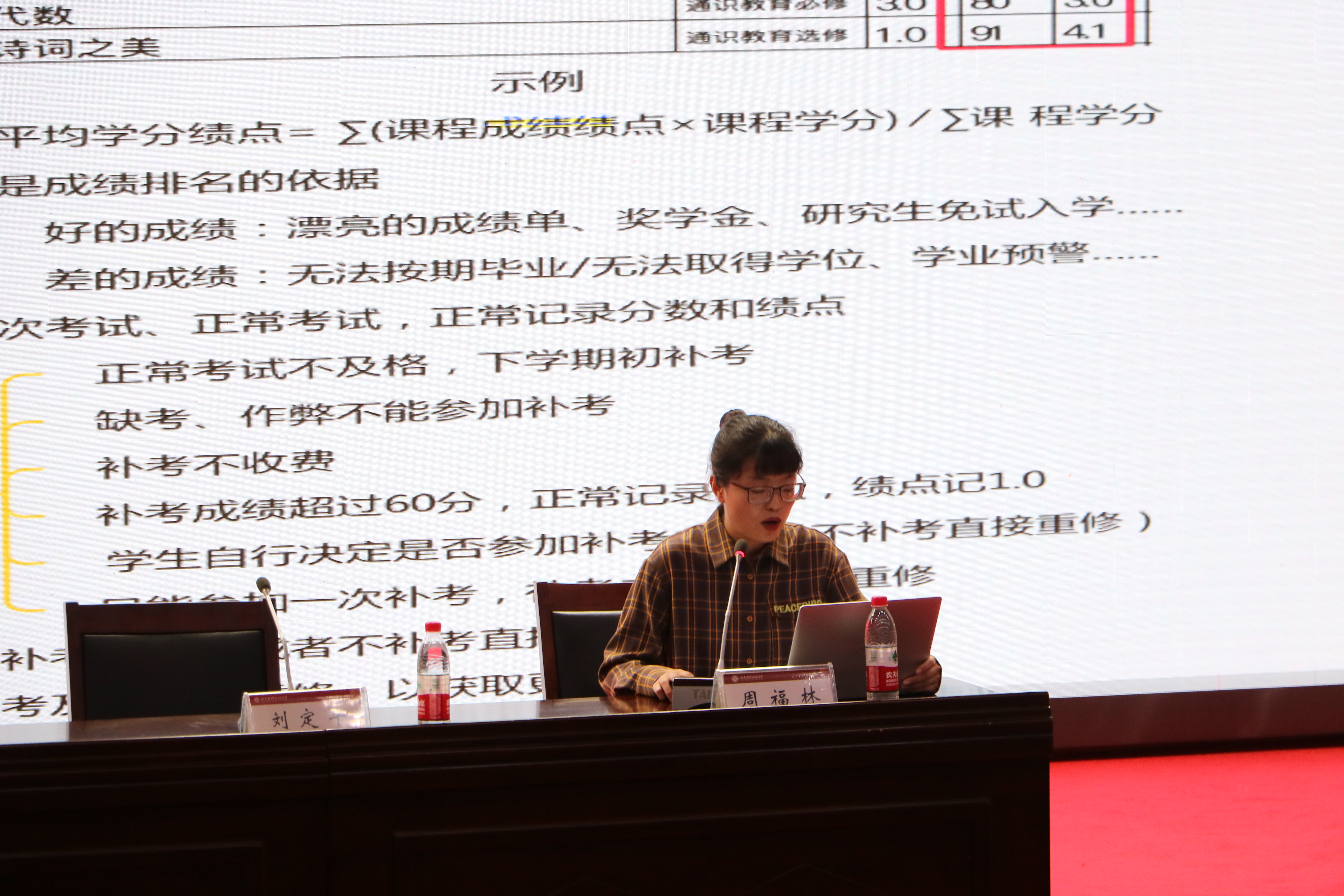 第二个环节由教学办公室副主任王祎仁详细解读了考试与成绩、毕业与学位、学籍异动、双学位与辅修专业、人才培养方案内容、教学办公室的工作内容、信息渠道等方面内容。