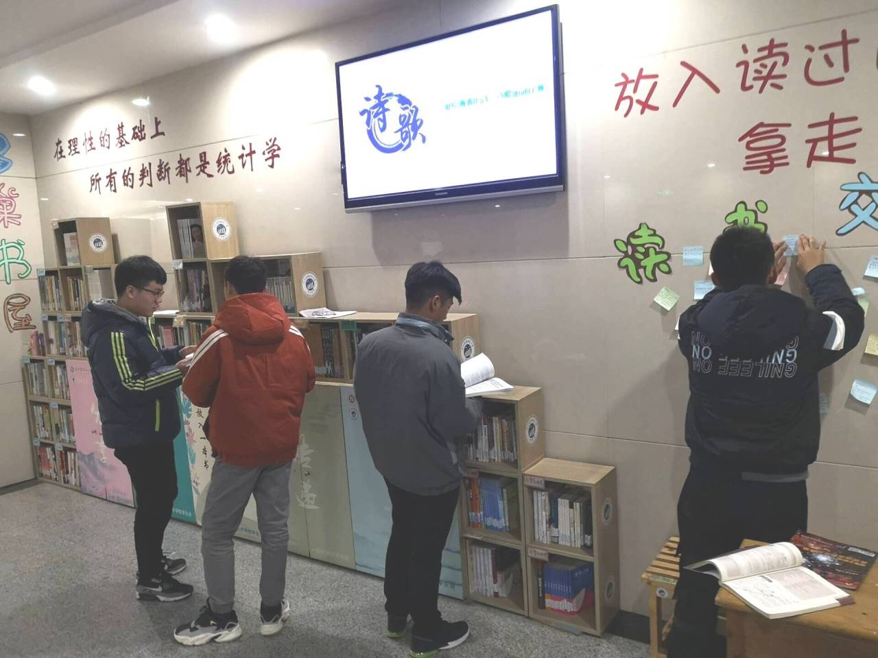 活动开展前,工作人员将书籍进行了分类,贴上标签,并将此次交流区划分为“经管社科”、“文学艺术”、“期刊杂志”三个交流区。同时我们准备了便利贴,大家可以写下对书籍的想法及对书籍内容的问题,最后将便利贴贴在“读书交流区”,等待其他同学的分享和回答。活动中,同学们在自己所感兴趣的交流区,或侃侃而谈,或静静聆听,现场气氛热烈。另外,有的同学把自己喜欢的书籍也带到了鸟巢书屋和同学们进行分享。