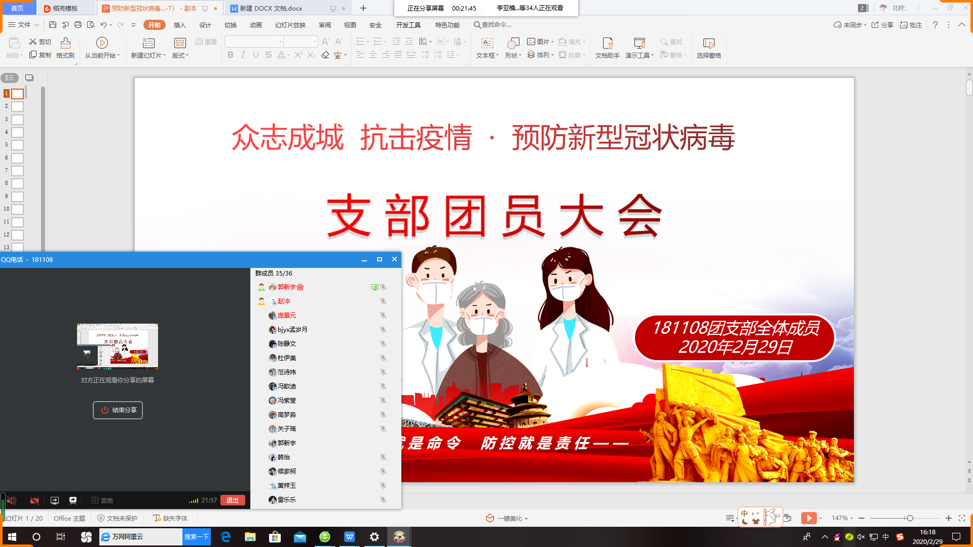 2月28日,为开展日报疫情防控工作,在班级层面建立工作小组,我院主学生干部协助各班组织开展了团员大会。