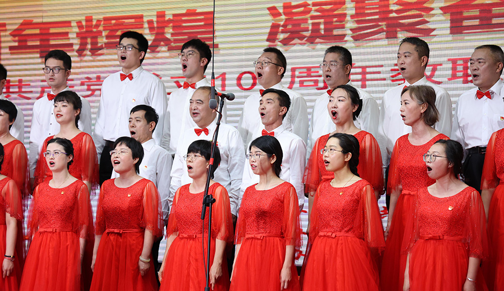 学院党委书记徐金安,院长、党委副书记刘定平等领导同志在队列居中位置参加歌唱,中共党员佩戴党员徽章参加歌唱。