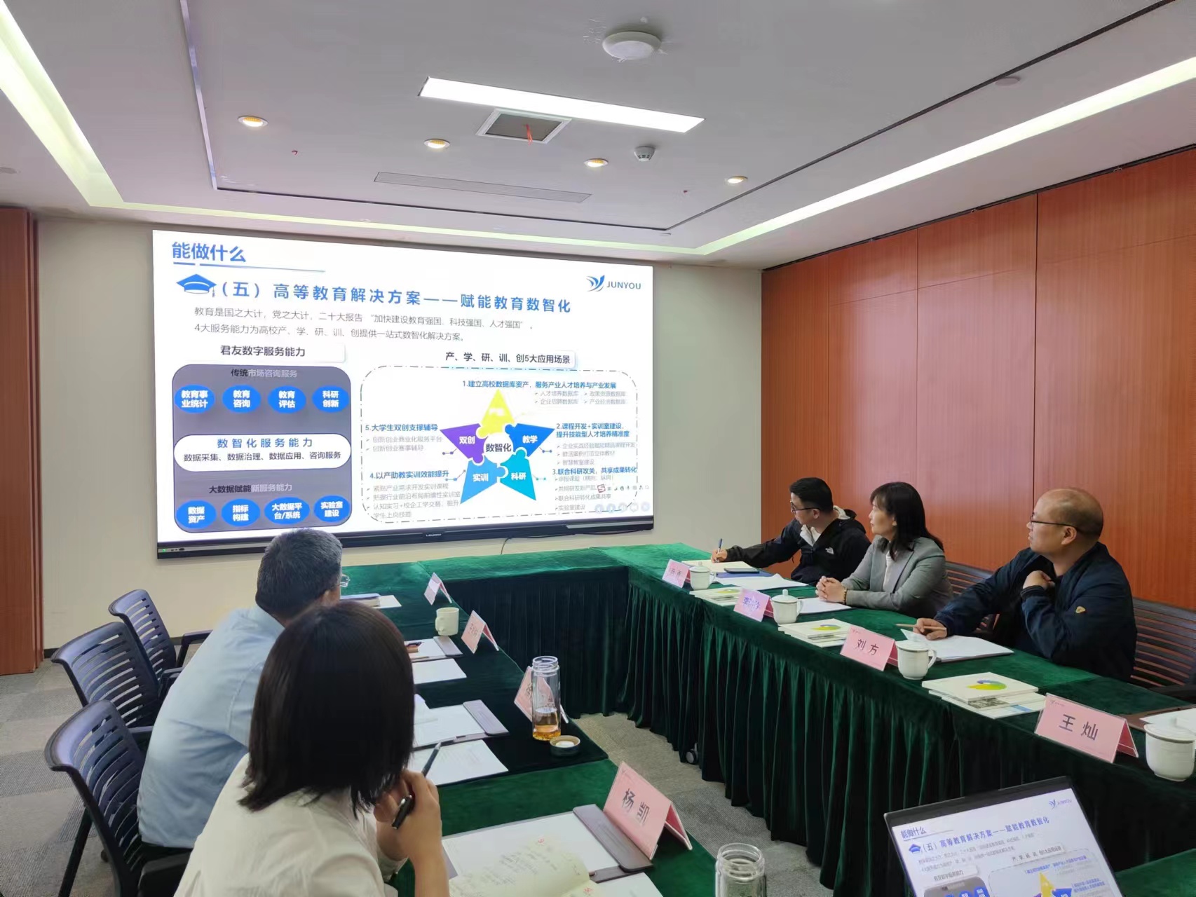 2023年5月11日下午两点半至五点我院领导老师于河南君友数字科技有限公司参加“访企拓岗”座谈交流会。我院院长刘方、党委副书记李洪玲、副院长商勇、团委副书记王灿以及河南君友数字有限公司董事长徐彦军、营销总监王松枝、党支部书记杨凯、董事会秘书赵倩倩出席此次座谈交流会。