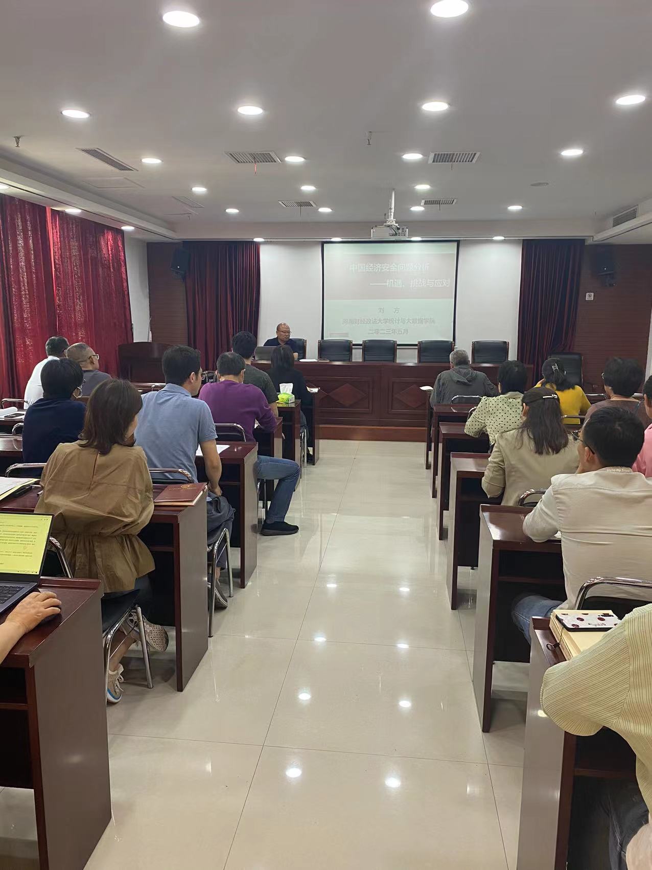 2023年5月22日下午,我院邀请校宣讲团成员、统计与大数据学院院长刘方为全体教师在教学科研楼826室举行了关于中国经济安全问题分析的主题教育宣讲。