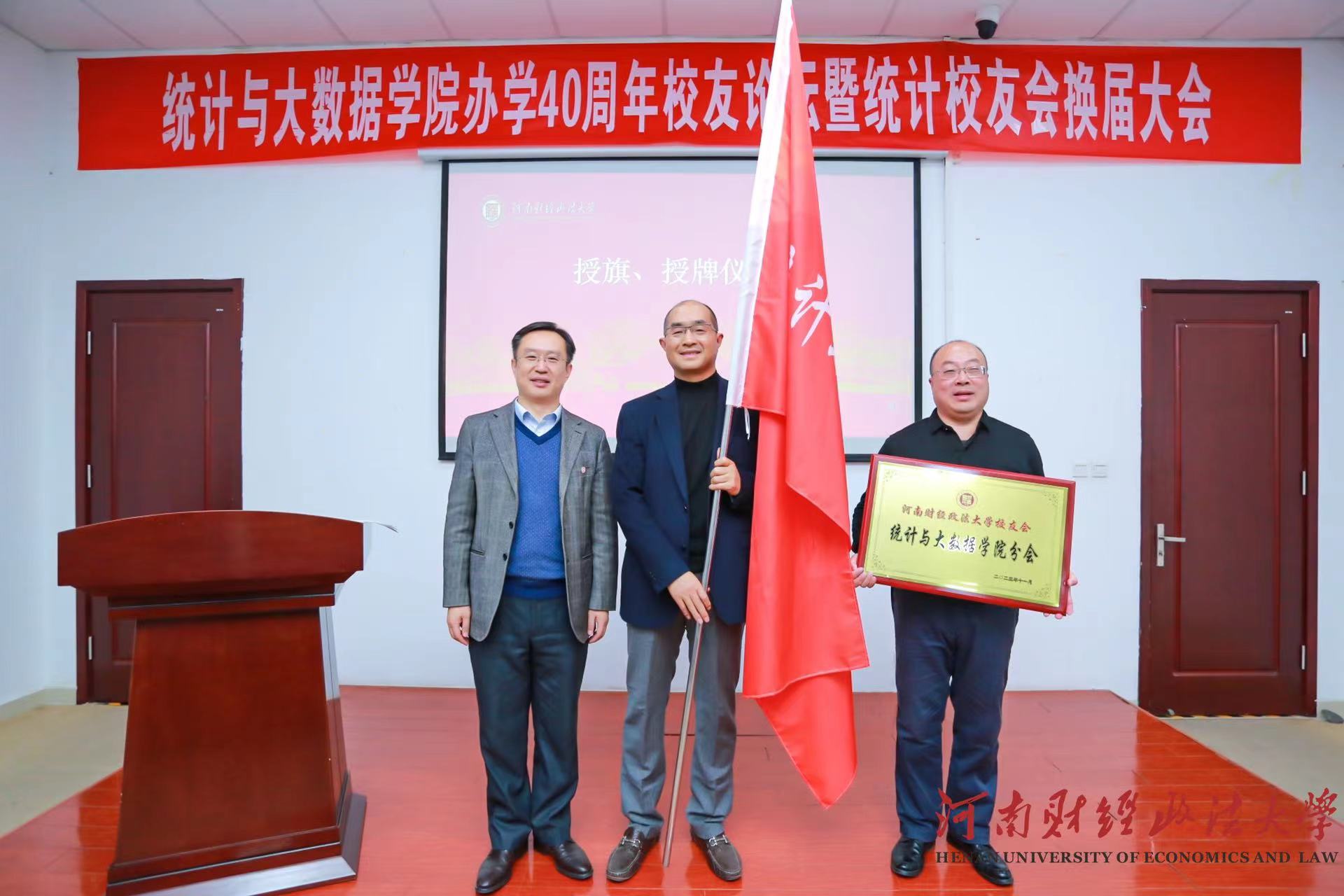 随后进行了统计与大数据学院校友分会的换届。现场选举产生了新一届理事会,由刘强担任新一届的校友会会长,徐化冰担任副会长兼秘书长。校友办主任杨凯现场宣读换届批复文件并为校友分会授旗、授牌。
