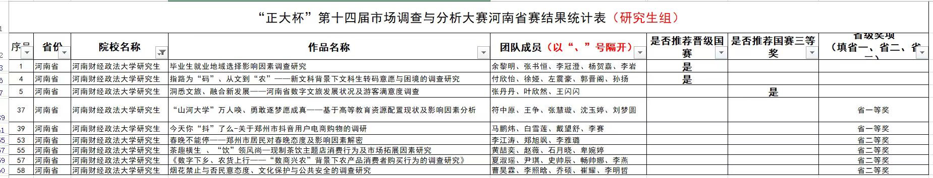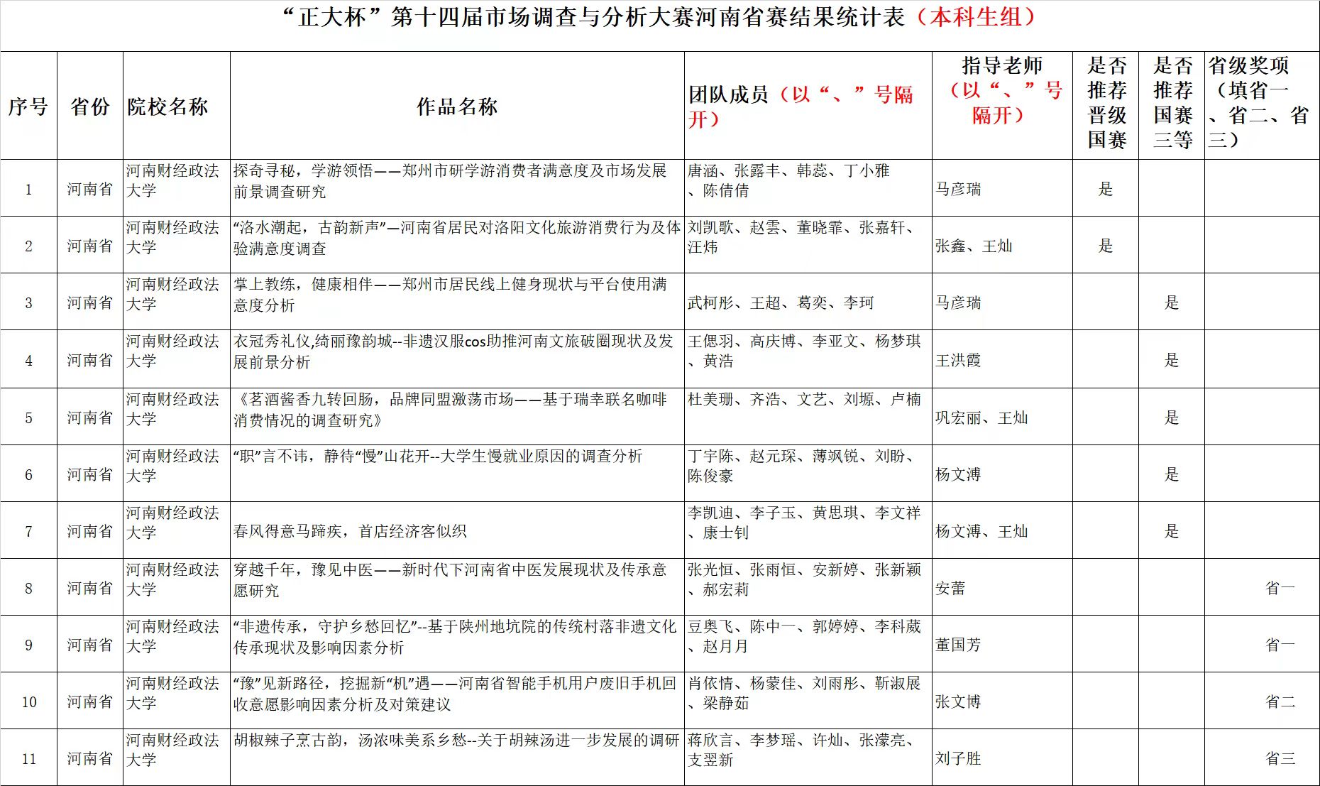 本科生组取得国家二等奖2项、国家三等奖5项、省级一等奖2项、省级二等奖1项、省级三等奖1项。其中,《探奇寻秘,学游领悟——郑州市研学游消费者满意度及市场发展前景调查研究》参加全国总决赛的现场赛。