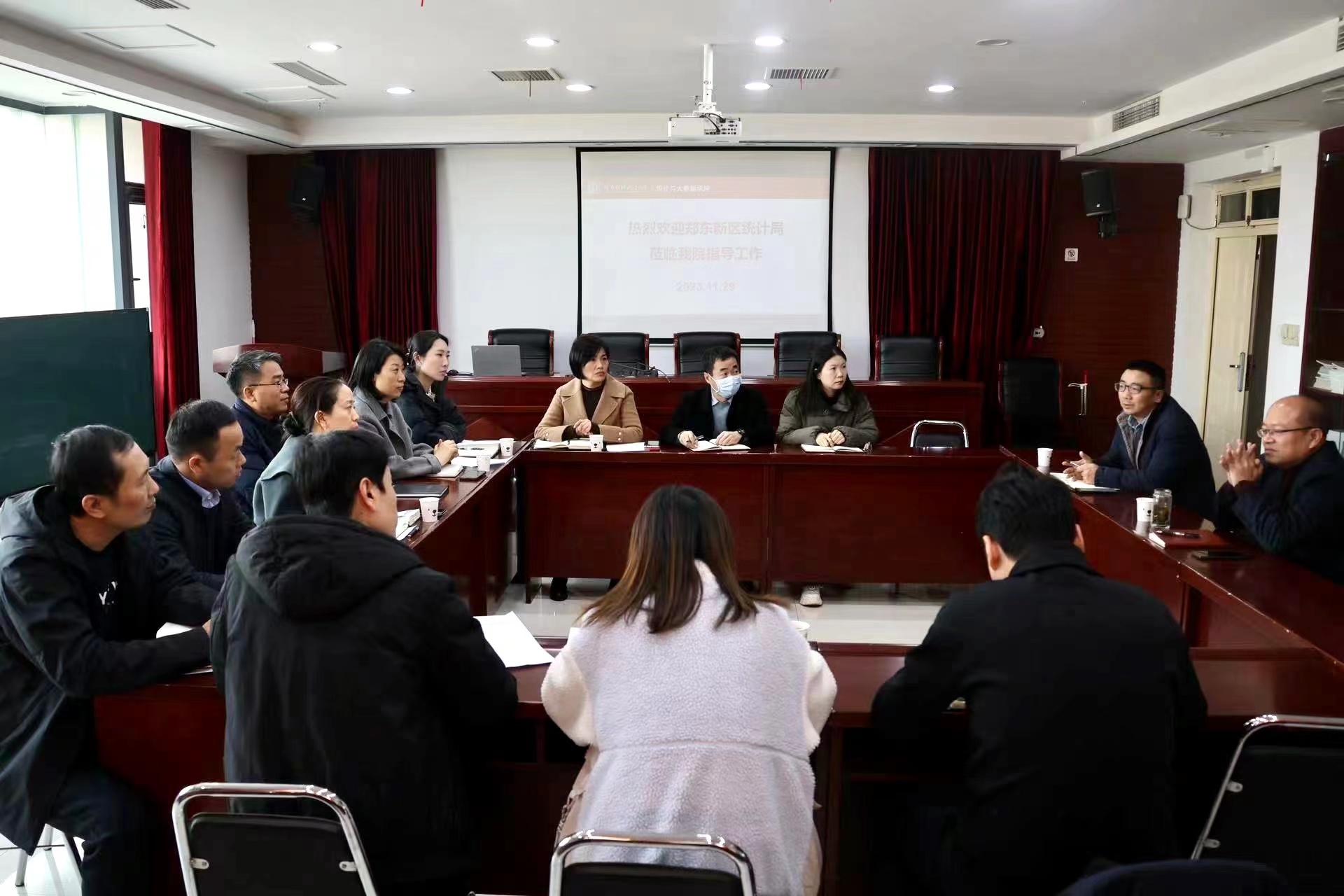 11月29日,郑州东区统计局刘晓嫩局长、宋红培副局长,及辖区内龙子湖、商都路和博学路办事处部分工作人员一行十余人来我院进行交流,我院院长刘方、副院长商勇出席本次会议。