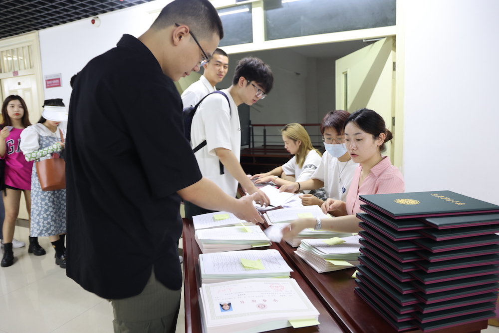 6月25日上午,学院为今年毕业并取得学位的本科毕业生发放毕业证书和学位证书,业已取得双证的毕业生逐个领取证书并签名。