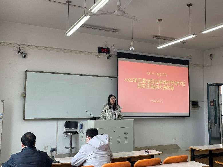 本次校级选拔赛主要以作品展示的方式进行,各参赛队伍先以PPT的形式对各自的作品主题进行讲解,运用专业统计方法展开分析,演示分析过程,展示调查结果。各组以不同的形式展示出我校应用统计专业硕士学位的学生们缜密的统计逻辑思维和睿智进取的精神风貌。最后,周院长点评,案例大赛是一种锻炼,也是对今后毕业论文的帮助,还建议在报告中加上数据来源和数据说明,方便以后别人的学习。靳院长也强调,准备作品也是成长最快的时候。