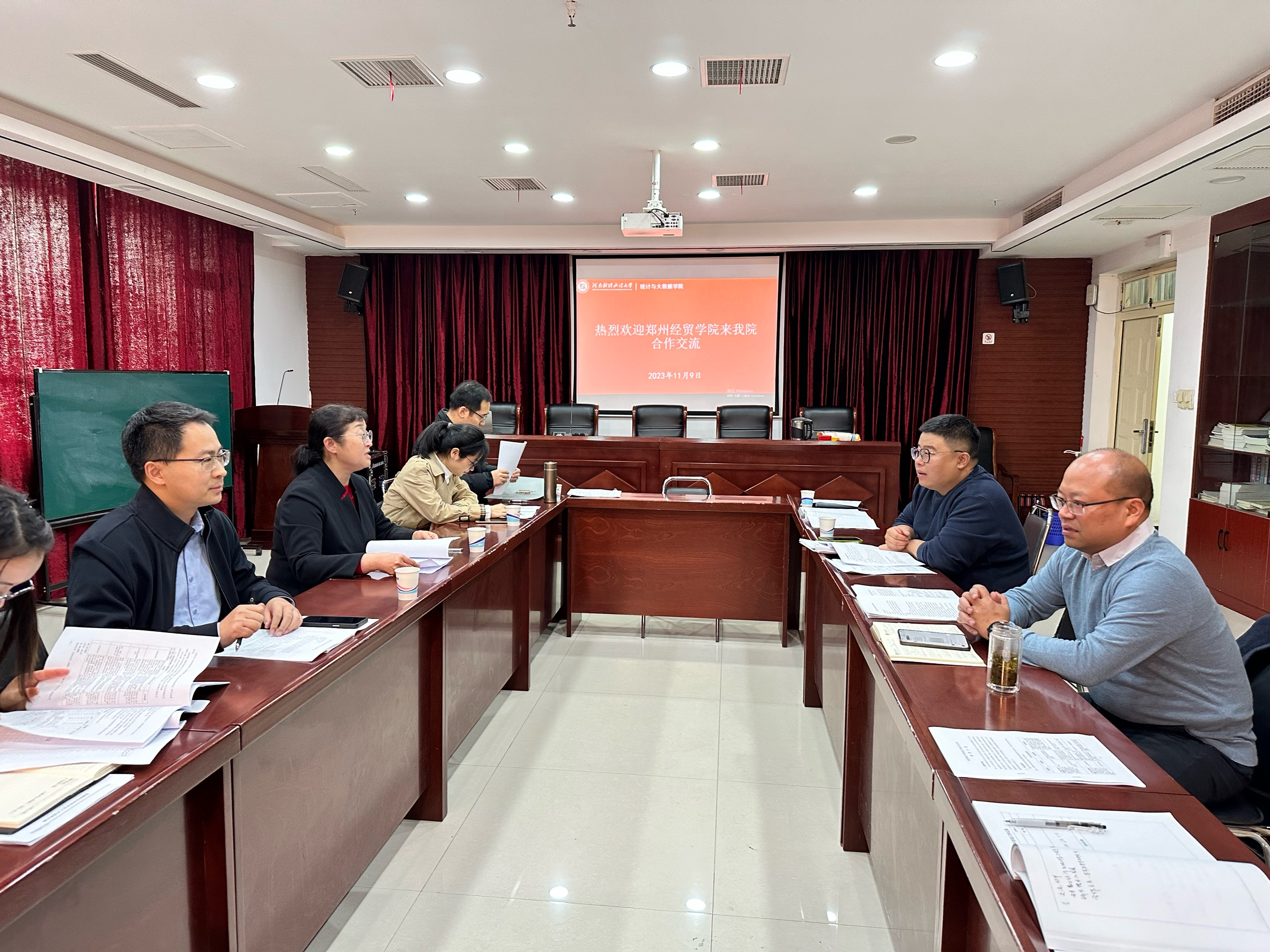 刘方院长对牛艳莉院长一行来我院考察调研表示热烈欢迎,并简要介绍了统计与大数据学院研究生与本科生专业建设的基本情况,着重对国家一流专业经济统计学和河南省一流专业信用管理学的建设过程进行了说明。牛艳莉介绍了郑州经贸学院经济学院信用管理、经济统计学等本科专业的基本情况,重点就信用管理专业和经济统计专业培养方案的修订作了详细说明。此外,双方还围绕相关专业的课程规划、学生就业、考研与科研项目合作等问题进行了深入交流。
