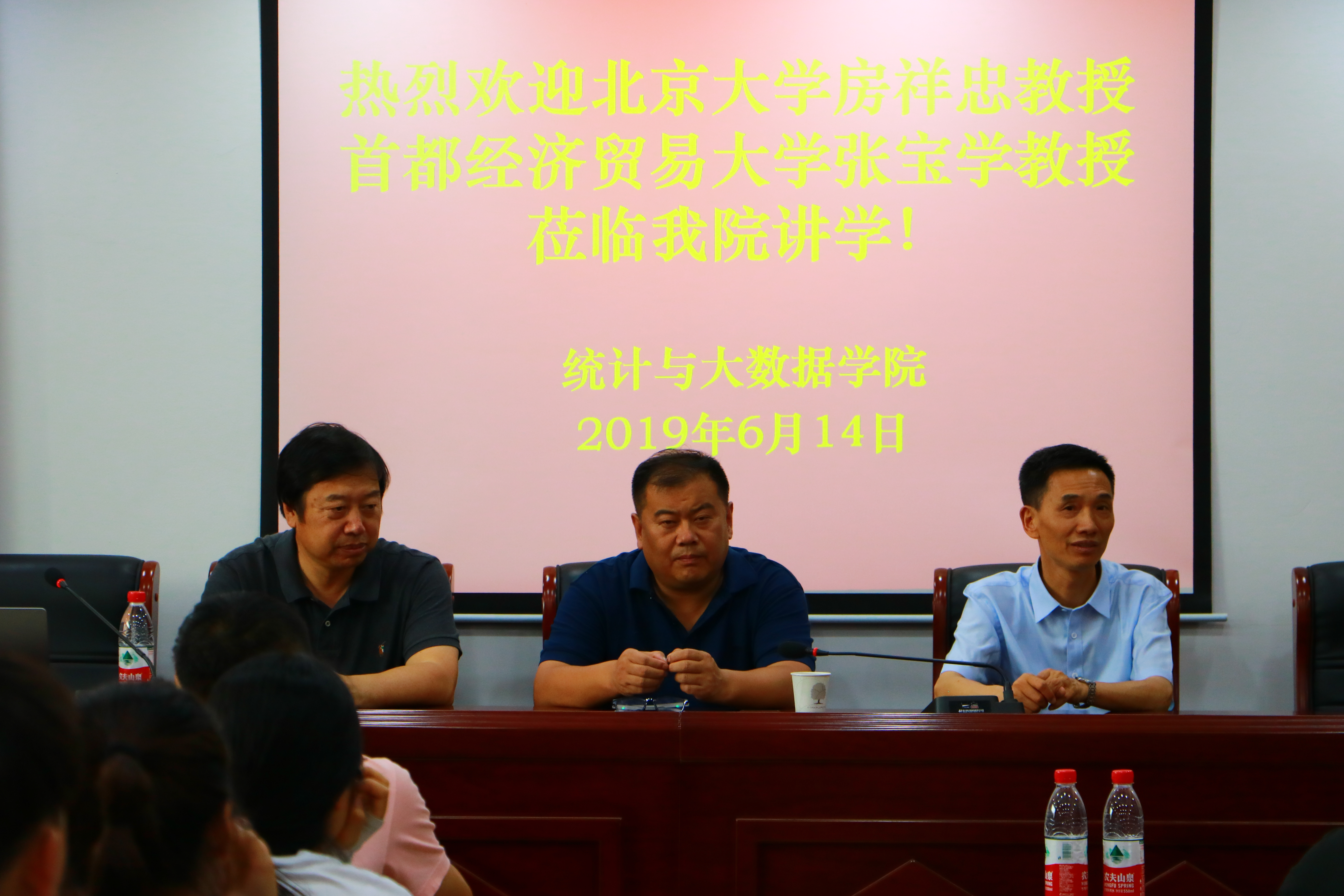 2019年6月14日下午,应我院邀请,教育部高等学校统计学类专业本科教学指导委员会主任委员、中国现场统计研究会理事长、北京大学数学科学学院房祥忠教授和首都经济贸易大学英国威廉集团院长张宝学教授应邀在我校教科楼A座826统计与大数据学院多功能室以大数据为题分别做讲座了讲座。会议由院长刘定平教授主持,我院首届数据科学与大数据技术专业的学生和部分老师参加了此次活动。