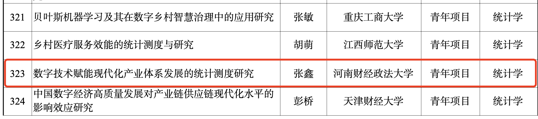近日,全国哲学社会科学工作办公室公布了2023年国家社科基金立项名单,我院教师张鑫博士申请的《数字技术赋能现代化产业体系发展的统计测度研究》喜获2023年国家社科基金立项资助。学院向张鑫老师表示热烈祝贺!