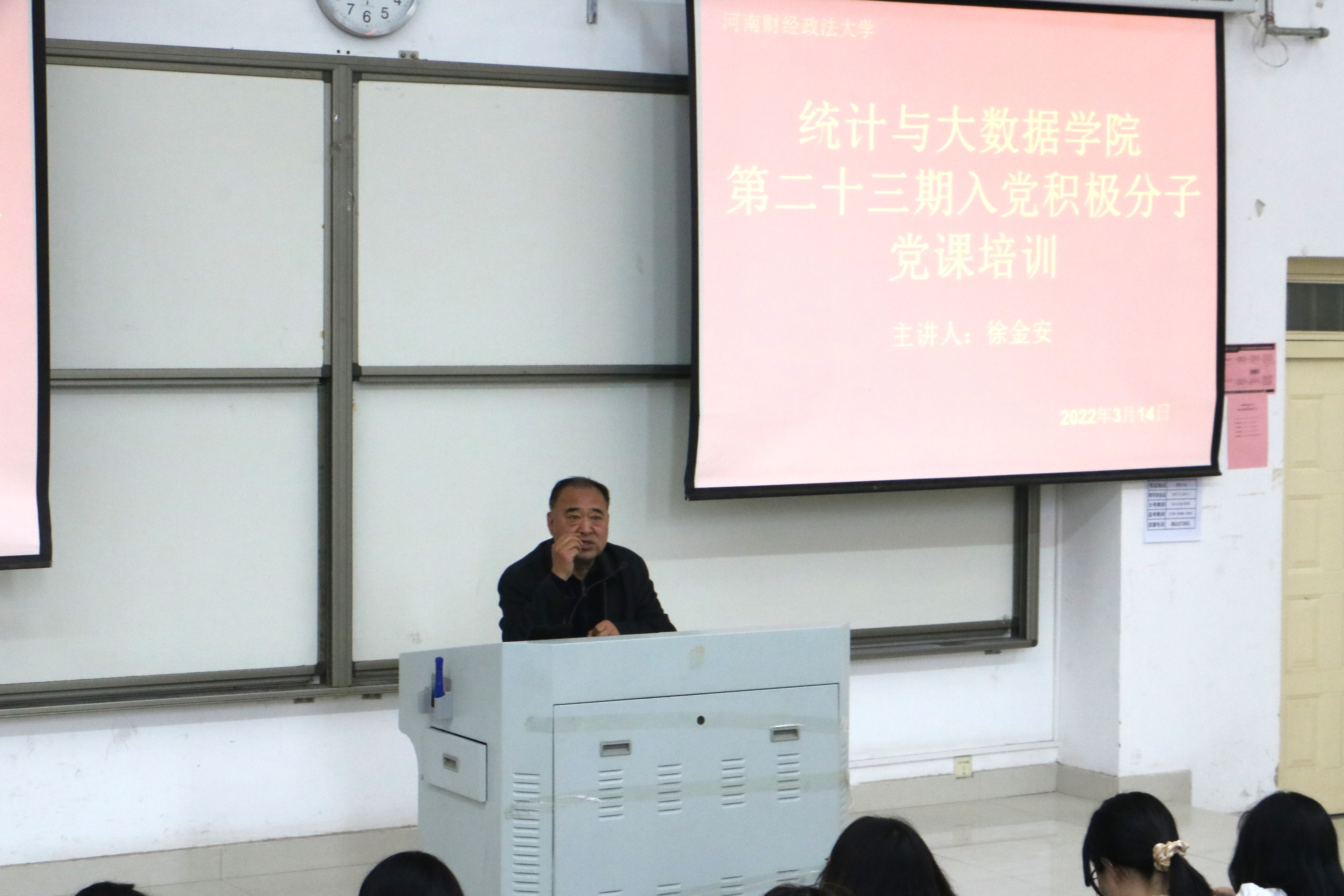 为做好入党积极分子党课培训工作,引导入党积极分子上好党课,我院于3月14日中午十二点在教学科研楼209教室召开统计与大数据学院第二十三期入党积极分子党课培训,院党委书记徐金安作为主讲人出席。