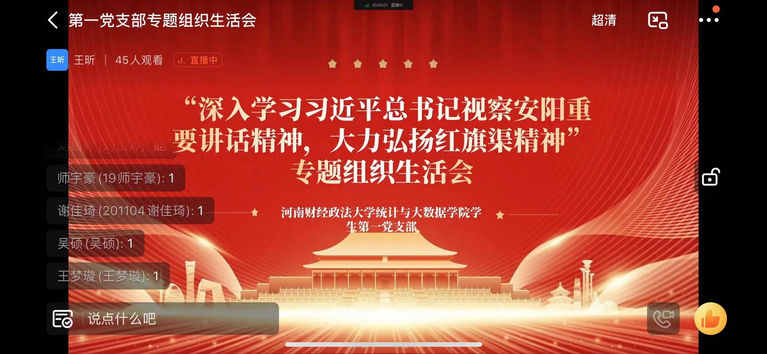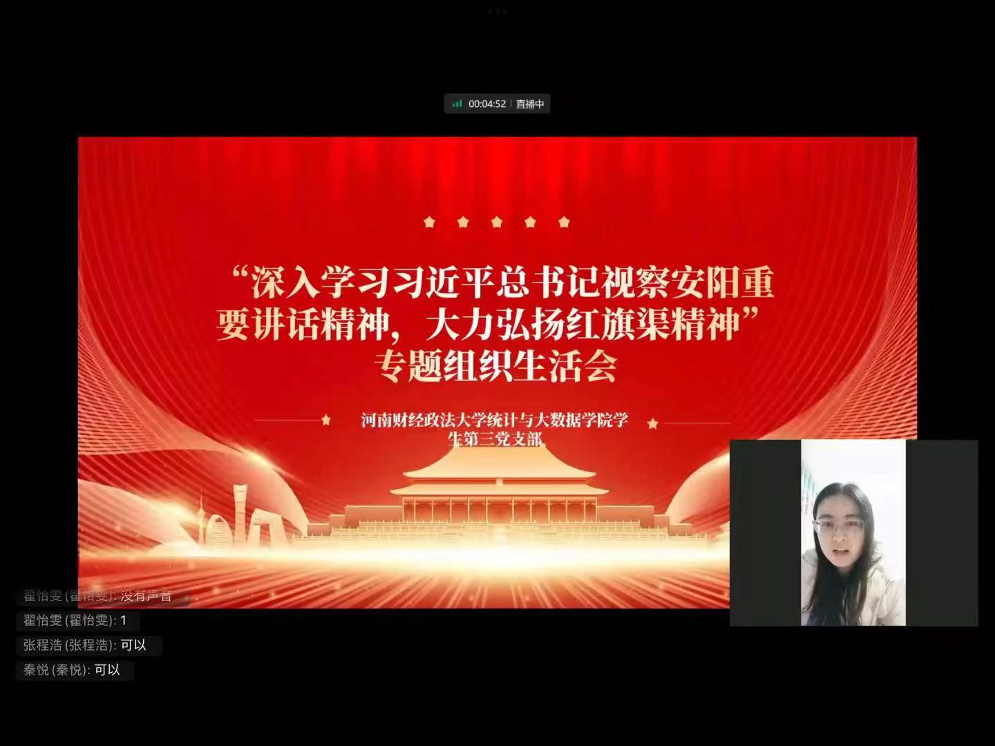 为深入学习习近平总书记视察安阳重要讲话精神,大力弘扬红旗渠精神,11月17日至29日,按照上级要求,统计与大数据学院教工党支部、学生第一党支部、学生第二党支部、学生第三党支部分别组织开展专题组织生活会。根据疫情防控要求,各支部主题组织生活会均通过线上会议形式开展。
