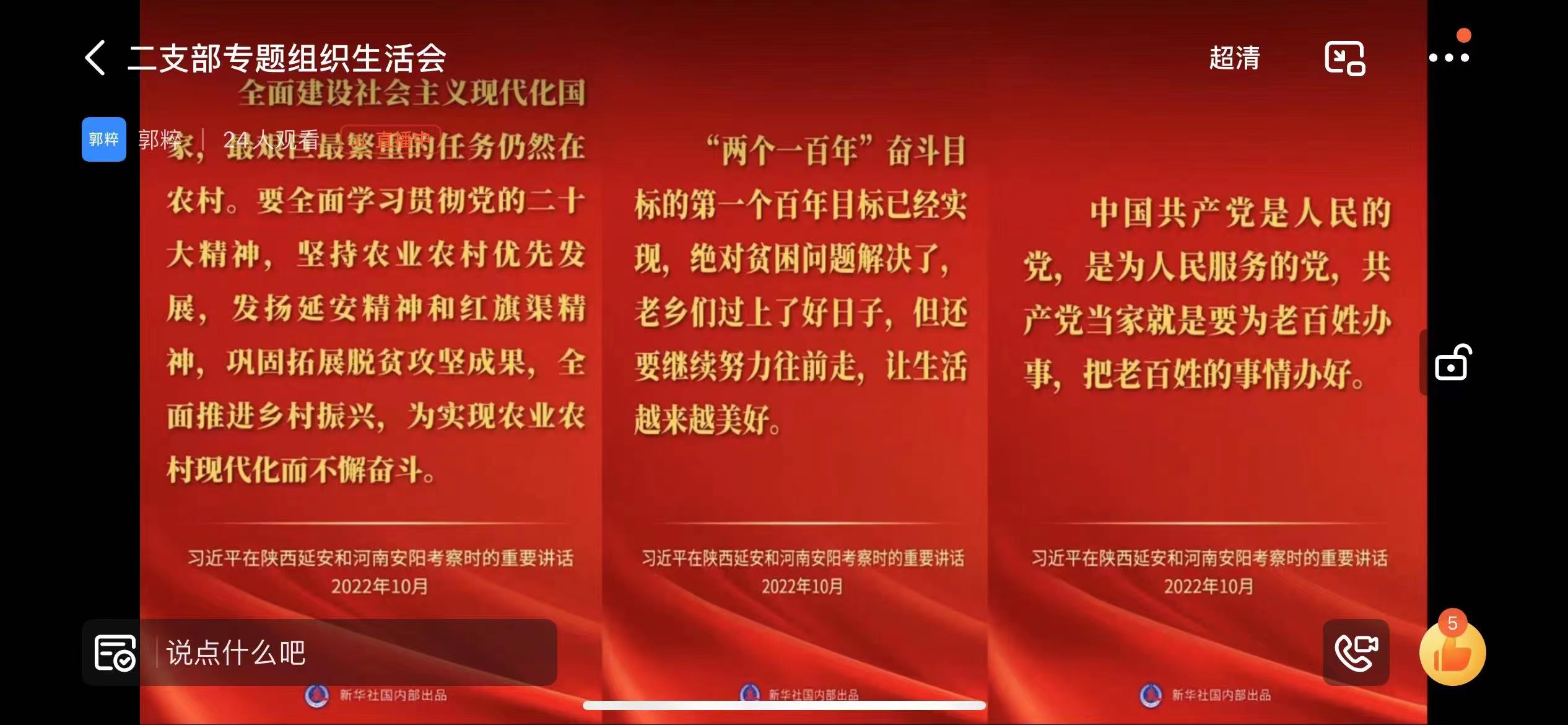 专题组织生活会主题为“深入学习习近平总书记视察安阳重要讲话精神,大力弘扬红旗渠精神”,各支部组织师生党员在线观看《红旗渠精神》专题纪录片并交流心得感悟,表示要进一步发扬红旗渠精神,吃苦耐劳、自力更生、艰苦奋斗,为实现党的二十大提出的目标任务而团结奋斗。