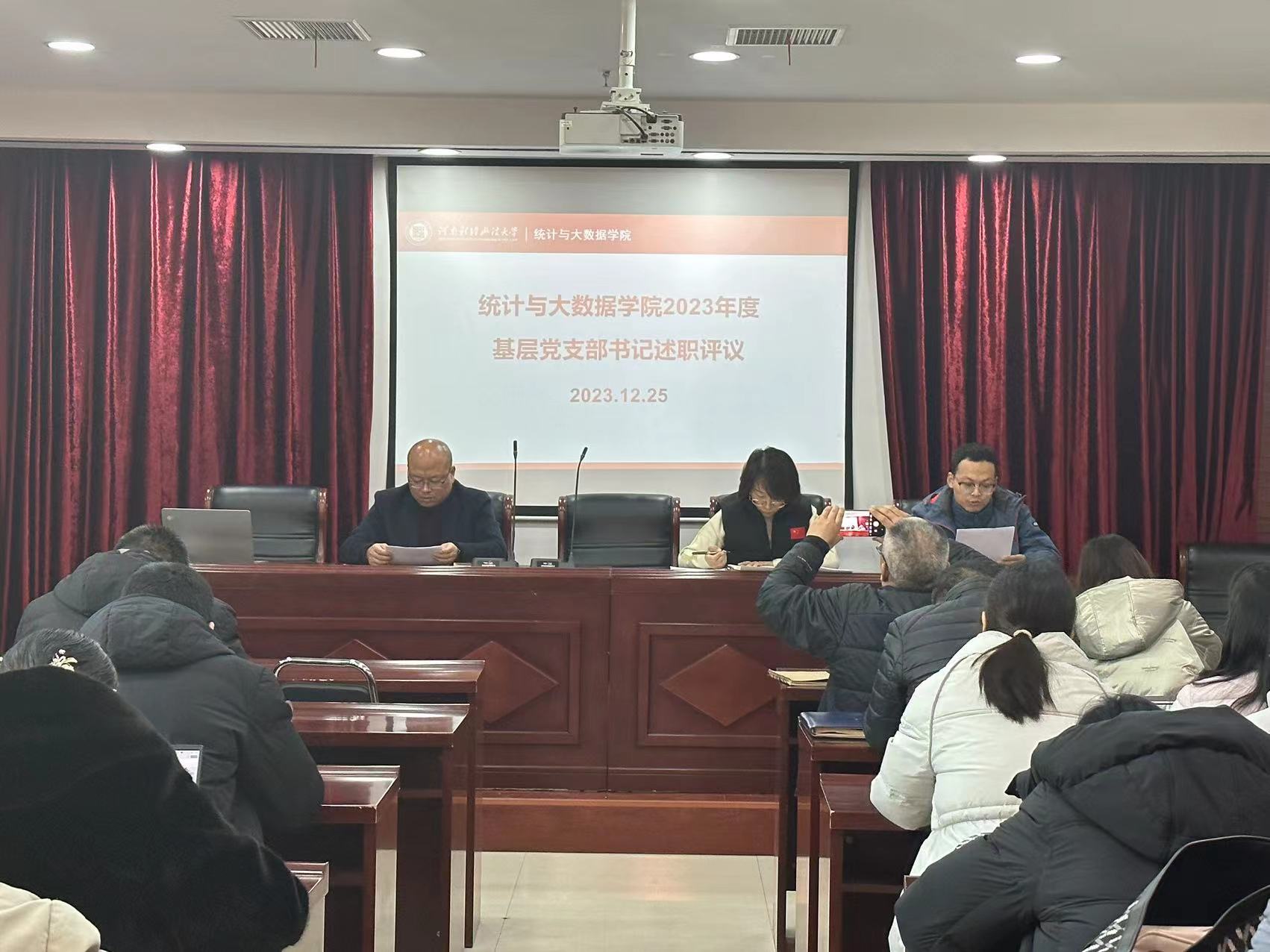 12月25日,我院于教科楼A座826会议室召开2023年度基层党支部书记述职评议大会,院党政领导班子、师生党员代表及数名群众代表参加会议。